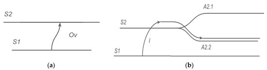 Two Thom graphs representing (a) the blessing in Saint Agnes as a catastrophe (in the mathematical sense) of the “gift” type; (b) the blessing in Saint Anthony as a catastrophe of the “ablation” type. S1 = “Priest”; S2 = “Collective actor consisting of both humans and animals”; Ov and I = “Holy water”; A2.1 and A2.2 = “Individual actors—blessed animals”. Thom’s graphs have been developed to represent the syntax of Tesniere’s bivalent and trivalent verbs.