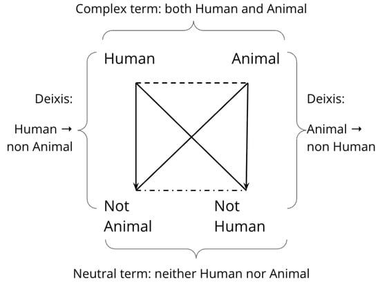 A semiotic square representing the Human vs. Animal category.