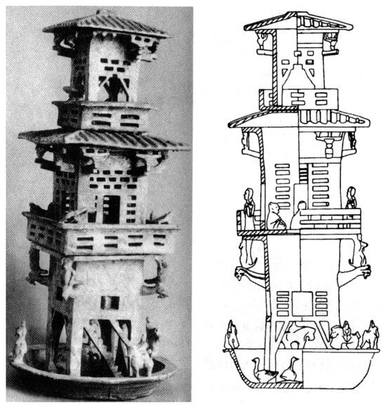 The evolution of Buddhist architecture in East Asia involves a complex adaptation process, integrating pre-Buddhist building typologies, vernacular construction techniques, and ritual spatial arrangements into emerging Buddhist architectural traditions. Existing monuments, such as stupas and cetiyas in the Indian subcontinent, emerged from socio-religious, cultural, and political traditions, influenced by local customs and external architectural elements from Iranian, Greek, and Roman territories. These structures did not arise in isolation but rather reflected diverse origins and developmental trajectories. The stupa closely resembles funerary mounds traditionally constructed from brick and stone in concept and structure. This is believed to have originated either from the thatched hut of the Toda tribes or the hollow cave stupas of South India. Similarly, the cetiya was adapted from vernacular house types, including sabhā, kutāgāra, prāsāda(paśāda), and vihāra, as described in Buddhist literature and depicted in inscribed reliefs (Y.-J. Kim 2015). Building upon these foundational types, the pagoda emerged as a uniquely East Asian architectural form, synthesizing Buddhist and indigenous design elements. The pagoda integrated multistory structural forms with vernacular building types such as lou (樓, multi-story towers), tai (臺, terraced platforms), ge (閣, pavilions), que (闕, watchtowers), guan (觀, observatory pavilions), and xie (榭, open terraced structures). These forms are illustrated in ancient relief sculptures, pottery, paintings, and existing architecture. Early Chinese architects utilized clay models as design tools to aid in construction. The unearthing of these models, often found in tombs, has granted scholars crucial insights into early Chinese architecture, much of which has not endured (Y.-J. Kim 2021). The pagoda merged the stupa with pre-Buddhist designs and transformed into a tiered, tapering structure topped with a sacred finial, showcasing a blend of local architectural styles and Buddhist symbolism (Y.-J. Kim 2024b). The elongated form of the pagoda, inspired by Central Asian architectural traditions, changed the circular plan of the Indian stupa into a four-cornered design with a prominent plinth, increasing its height in accordance with the architectural aesthetics of China, Japan, and Korea. Although square plans were previously employed in the Gandhara Buddhist monuments, their integration into East Asian Buddhist architecture was influenced by Greek–Roman styles in temples and tumuli design (Kuwayama 1978; Kim and Han 2011).