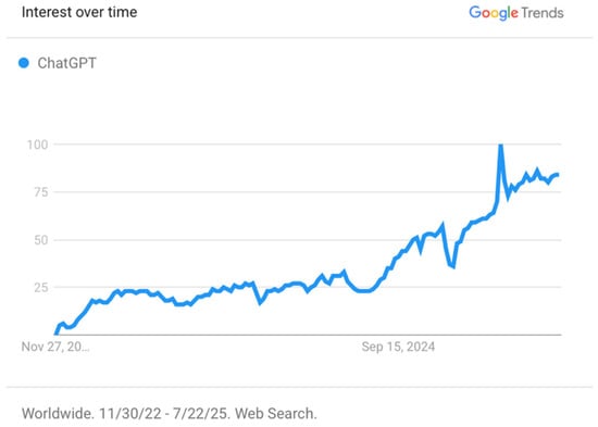 - Google. 2025. Google Trends on “ChatGPT” 11/30/2022–07/22/2025. Available online: https://trends.google.com/trends/explore?date=2022-11-30%202025-07-22&q=ChatGPT&hl=en (accessed on 22 July 2025).
