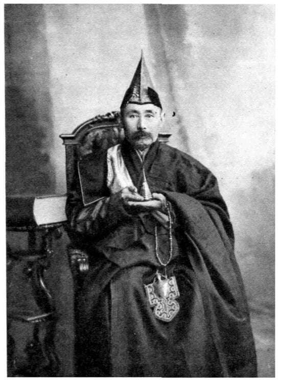 “…Already on the way to Tibet, we heard reports that there (in Hlasa) lives a soibun42 of the Gegen43, a Mongol named Buryat Akban. It was said that if one were to become acquainted with this person, it would be highly beneficial for a Mongol visitor. Knowing this, we introduced ourselves to him immediately upon our arrival in Hlasa. He received us warmly and honored us greatly. We became very good friends with him, conversed often, and he guided us in all our affairs. During our audiences with the Dalai Lama and the Nomuyin Khan44, this Akban advised and accompanied us with great skill. As for the residence of this soibun, he lived in the state baishin45 of the Gegen and, according to stories, from among the people speaking the Mongolian language, there has not yet emerged a person who would rise so high in Tibet as he did, no other Mongolian-speaking individual had ever risen so high in the Tibetan hierarchy. We reported to this Akban soibun the intentions we had formulated back in our native nomad camps, the details of our journey, and everything else. We asked him not only to guide us, but also to assist those from our homeland who might come in the future to make pilgrimage to Zū46. He graciously agreed to help both them and us—the people of a country from which no one had come to Tibet for many years.”(Pozdneev 1897, pp. 211–12)