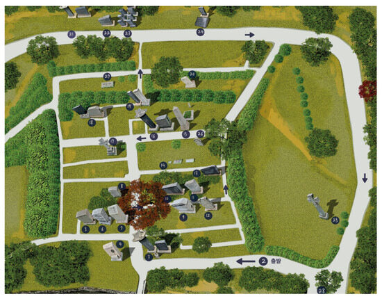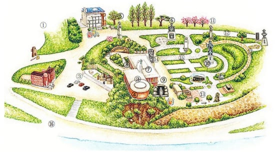 From the urban locational perspective, Yanghwajin Cemetery now occupies the northeast side of the former Yanghwajin ferry site in Mapo District, Seoul. The terrain is flat, and the overall plan is rectangular, divided into a grid by intersecting north–south and east–west pathways. The main entrance is situated on the central south axis, which extends along the north–south axis from the main entrance (Figure 2, label 2) to a secondary entrance at the northern end, forming a visual and ritual procession route. Secondary north–south paths intersect with east–west service lanes, subdividing the site into nine functional sectors. Within each sector, tombstones are arranged compactly, forming discrete grid blocks. This layout reflects the Protestant ideal of equality among all individuals and aligns with the ordered production of urban public space. Observers proceeding north along the main axis follow not only a geographical direction but also a narrative progression, from early missionaries to post-war burials and onward to the infant section, completing a spatial sequence layered with historical temporality. By 2005, Yanghwajin had been in existence for 115 years and contained 877 graves; after 2005, no new monuments have been permitted. The burial ground covers approximately 13,224 square meters and includes 417 individuals from 15 countries, among them 145 missionaries from six different nations (Yanghwajin Foreign Missionary Cemetery 2022). According to Jeong Ae-ju’s 2015 statistics, Yanghwajin inters 114 missionaries, 28 missionary children, and 17 non-religious individuals (Jeong 2015). Among these burials, 60 epitaph records are clearly documented (see Appendix A). These epitaphs form the core corpus for this study.