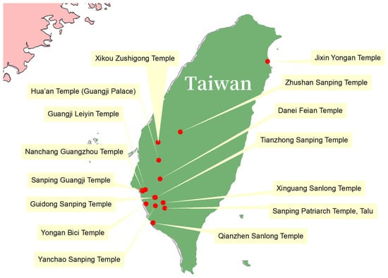 The transmission of the Sanping Patriarch belief into Taiwan primarily relied on the clan-based networks of immigrants from Zhangzhou and Quanzhou. Its earliest presence can be traced back to the Qing dynasty.16 According to incomplete statistics, there are currently 15 temples in Taiwan that primarily venerate the Sanping Patriarch (Table 1), with a concentrated distribution in areas such as Tainan and Kaohsiung, where Zhangzhou and Quanzhou 泉州 immigrants historically settled (Figure 3). This spatial pattern reflects the close relationship between the spread of the belief and the migratory routes of southern Fujian settlers. It is thus evident that the Sanping Patriarch belief is more prevalent in southern Taiwan, mainly because many Zhangzhou immigrants landed and settled in this region (Dong 2013, p. 31).