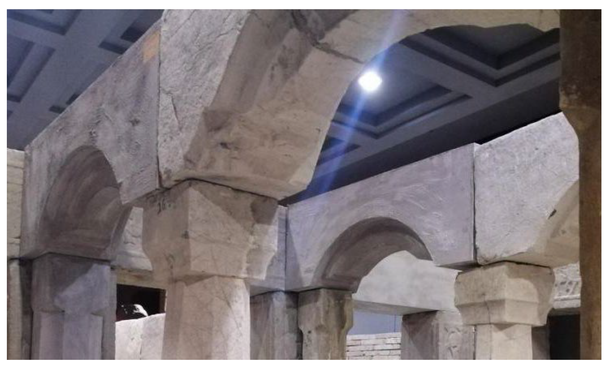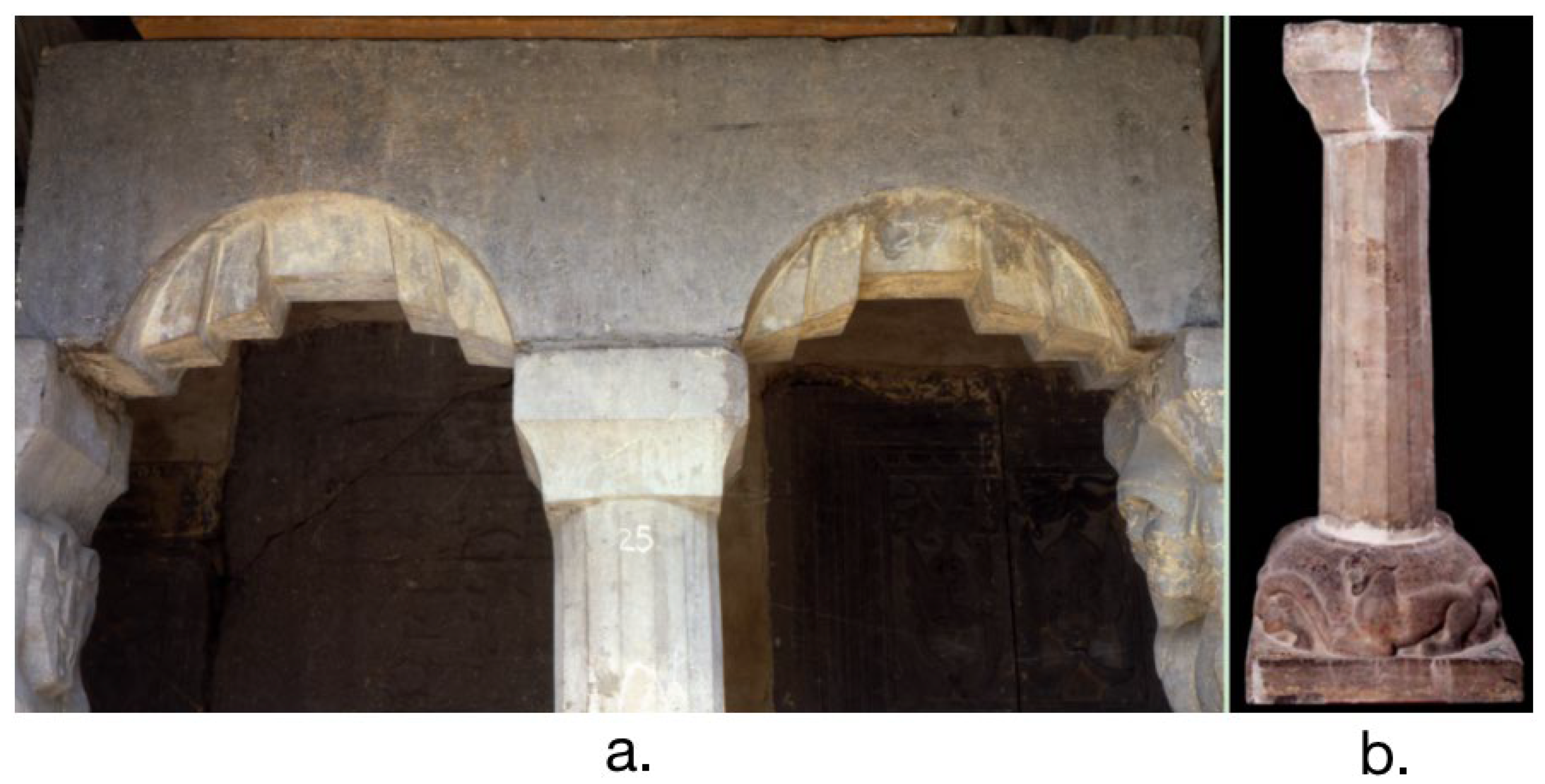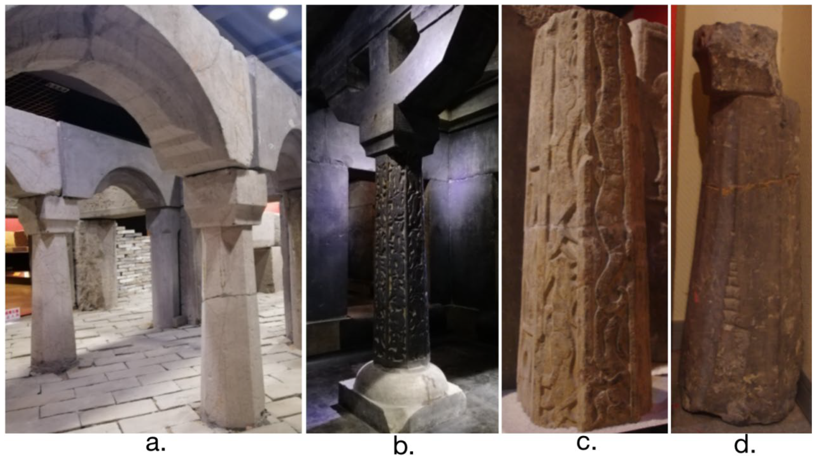 - Dashenliuzhuang Tomb, Ju County (Shandong): Two sets of tapered octagonal columns supporting twin arches in the front chamber (plain surfaces) (Figure 3a).
