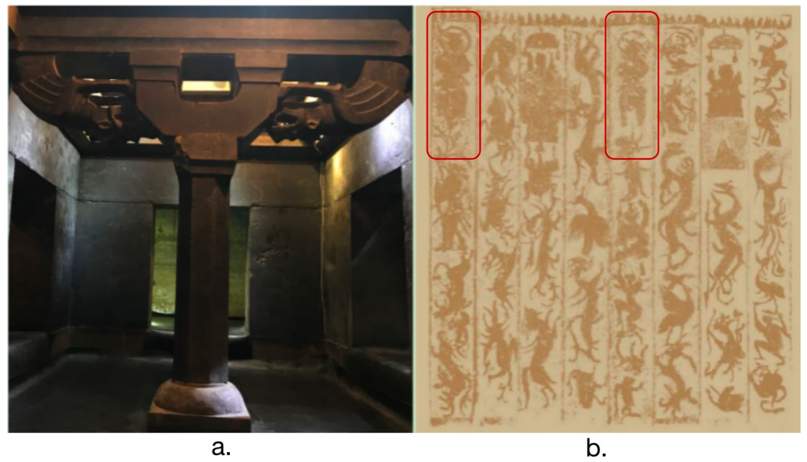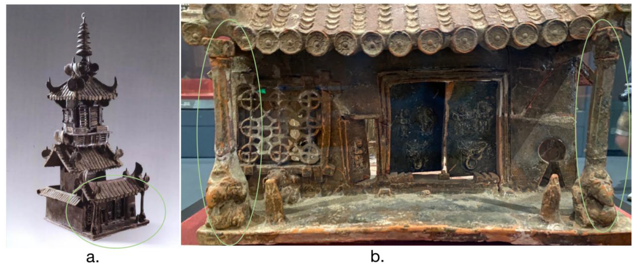 - Wubaizhuang Tomb (Shandong): Square columns supporting a single arch in the central chamber. Columns depict high-relief tigers and bears; the arch interior features carved lion heads (Figure 13a).