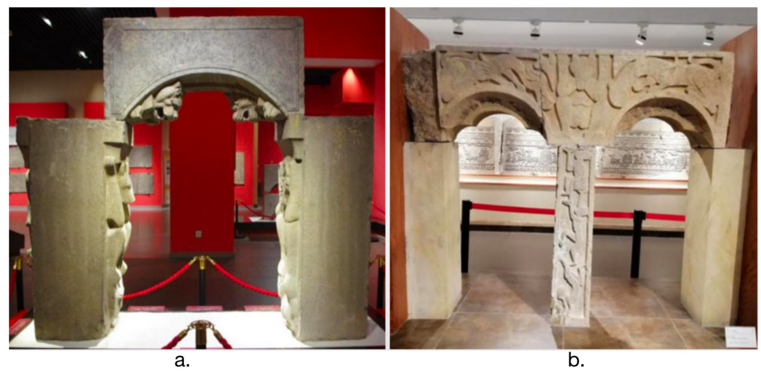 - Xuzhou Han Stone Relief Museum (Jiangsu): Twin-arch structure adorned with auspicious beast imagery (Figure 13b).