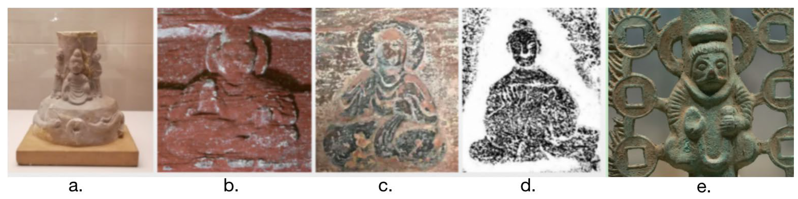 - Liu, Yi 劉屹. 2025. Donghan shiqi de foxiang yu fojiao tuxiang 東漢時期的佛像與佛教圖像 [Buddha Statues and Buddhist Imagery during the Eastern Han Dynasty]. Chinese Historical Studies 《中國史研究》 3: 75–93. [Google Scholar]