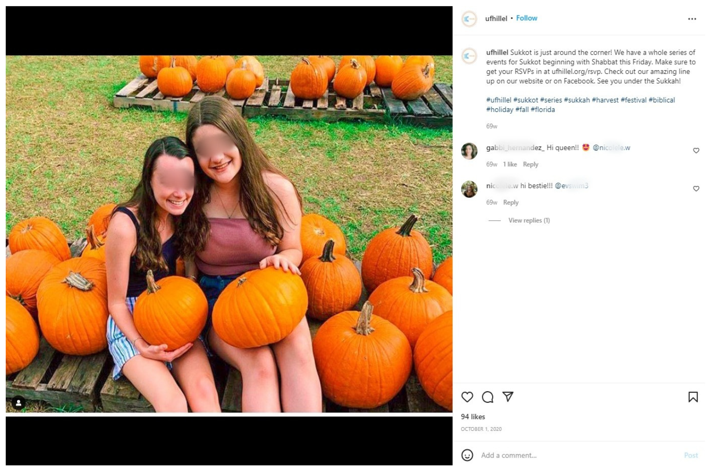 To illustrate, Figure 8 and Figure 9 from the University of Florida feature students incorporating symbolic elements from American seasonal traditions. Figure 8 displays Halloween pumpkins alongside invitations to Shabbat events and the Sukkot Jewish holiday celebrations. Figure 9 documents a ‘fall celebration’ featuring collaboration with Greek Life organizations, emphasizing integration into American cultural patterns.