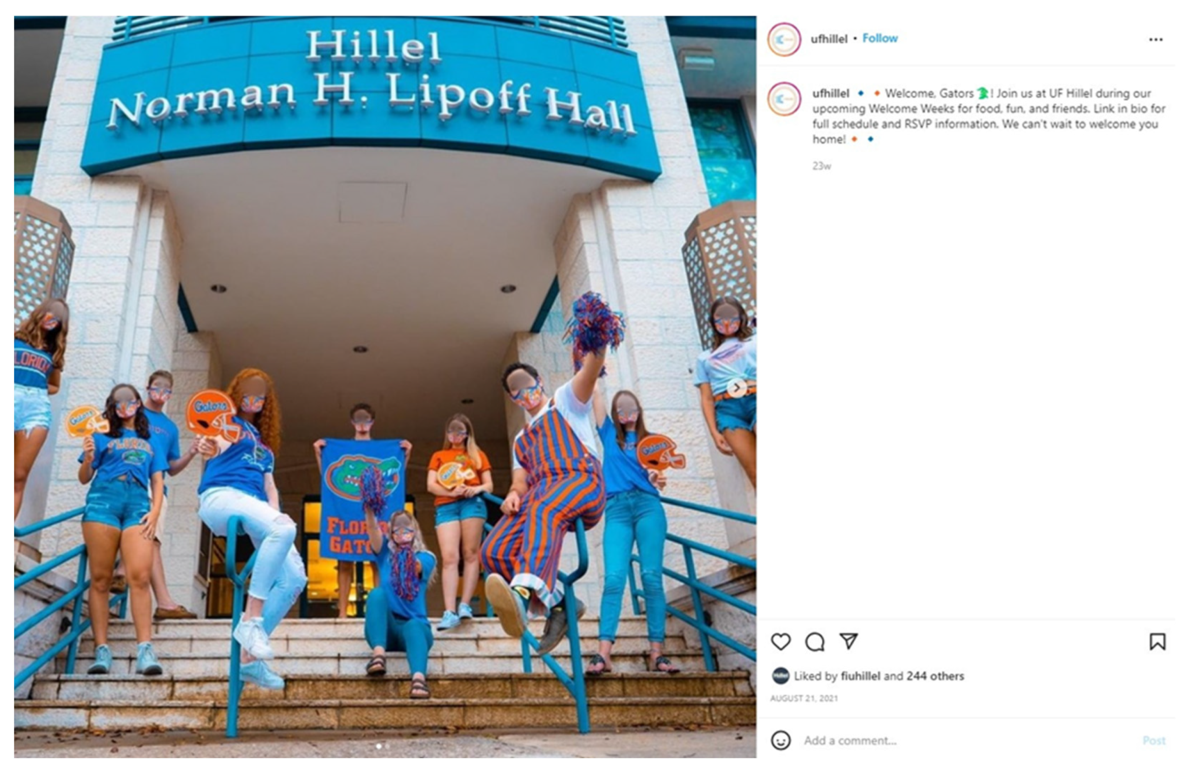 Figure 14. Students are photographed at the entrance to the Hillel Center wearing the university’s brand colors.