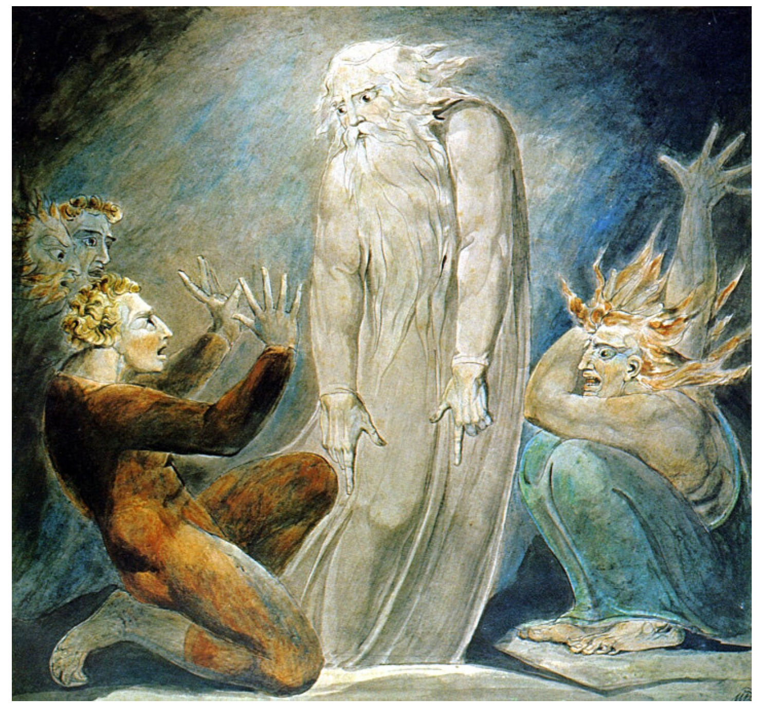In this work, Blake situates the female figure in a prominent compositional position, emphasizing her mediating role, while the scene accentuates gesture to heighten the drama of the encounter: the open hands of Saul and the woman, their intense gazes and slightly parted lips. Expressive force prevails over naturalistic representation, reflecting Blake’s visionary spirit in contrast to academic convention. The woman’s conspicuous visibility, her face, hands, and bodily orientation offered to the viewer, functions here as a visual authorization of her mediating role, in sharp contrast to later images in which that role will be progressively displaced or obscured.
