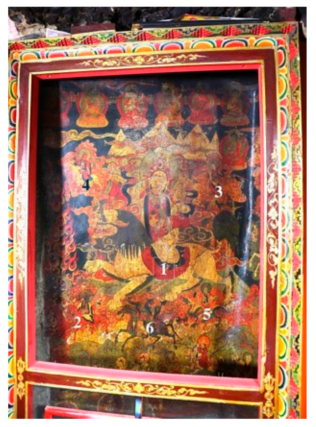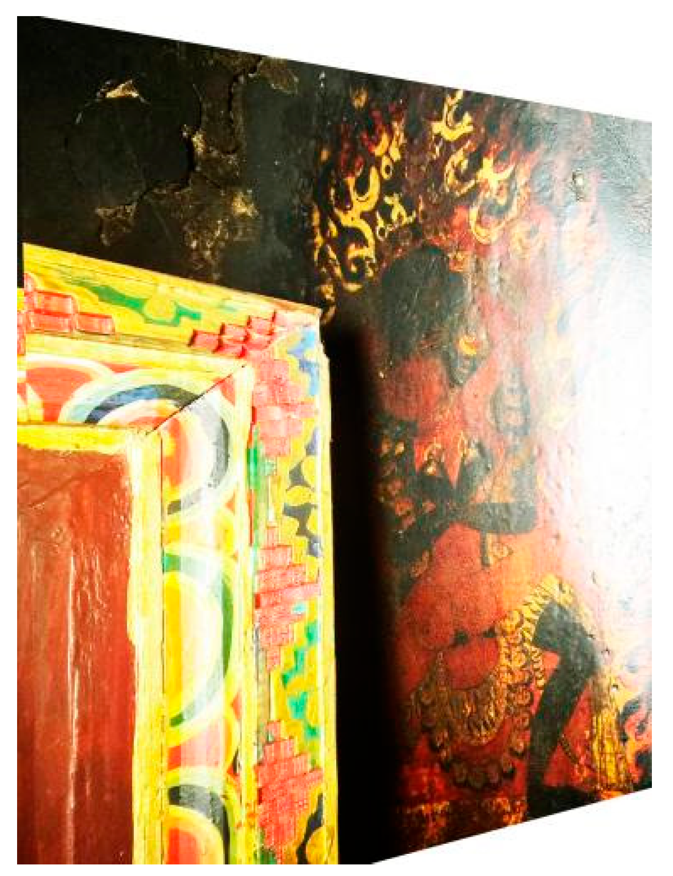 - Mural Compilation Group of Xizang People’s Publishing House 西藏人民出版社壁畫編寫組, ed. 2011. Xizang bihua quanji ali juan yi 西藏壁畫全集·阿裏卷 (1) [Complete Collection of Tibetan Murals: mNga’ ris Volume 1]. Lhasa: Xizang People’s Publishing House 西藏人民出版社, p. 69. [Google Scholar]