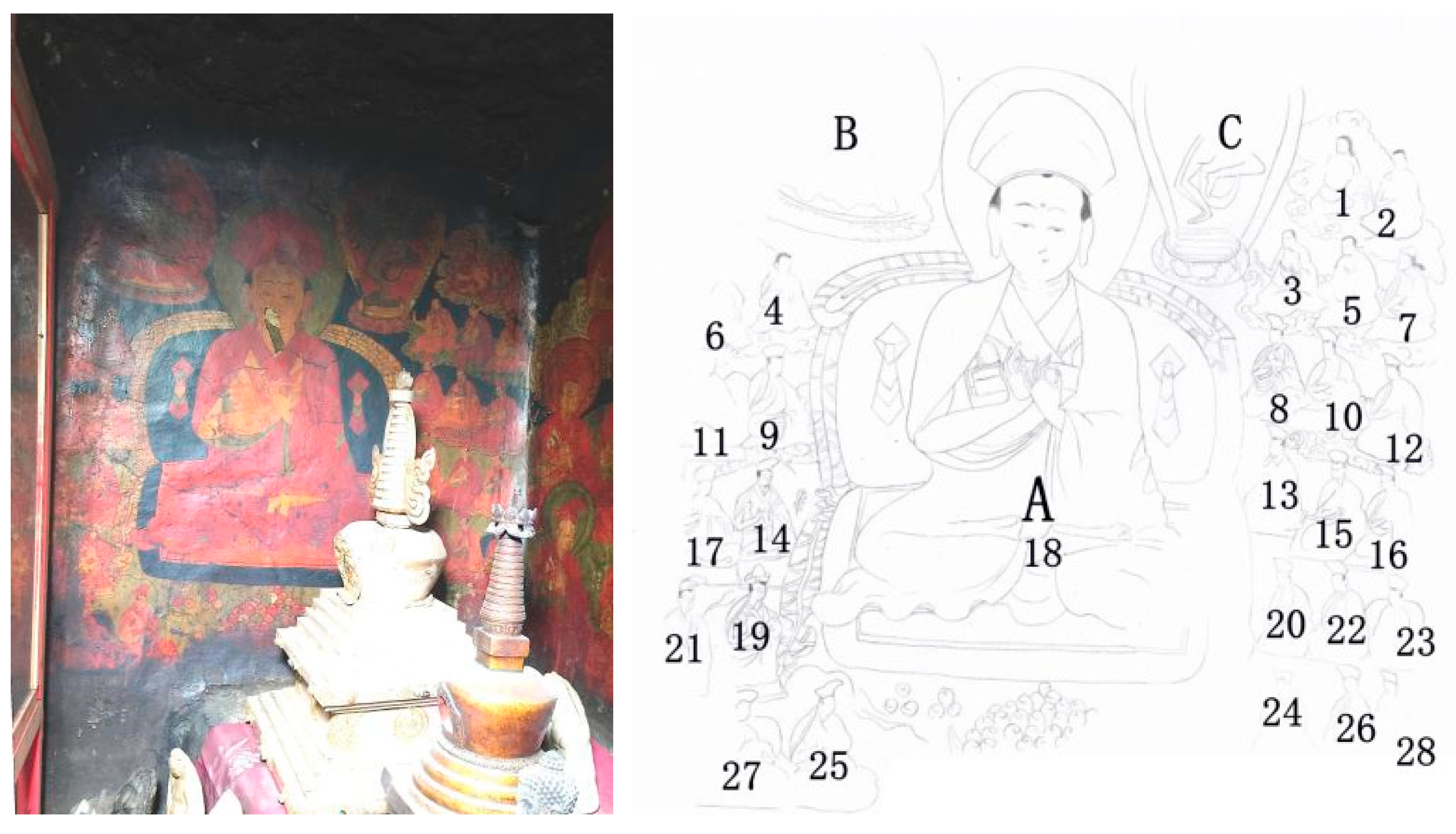 | Number | Main Figures and Two Attendants | Surrounding Images | The Current Situation of Inscriptions | Connotation | ||