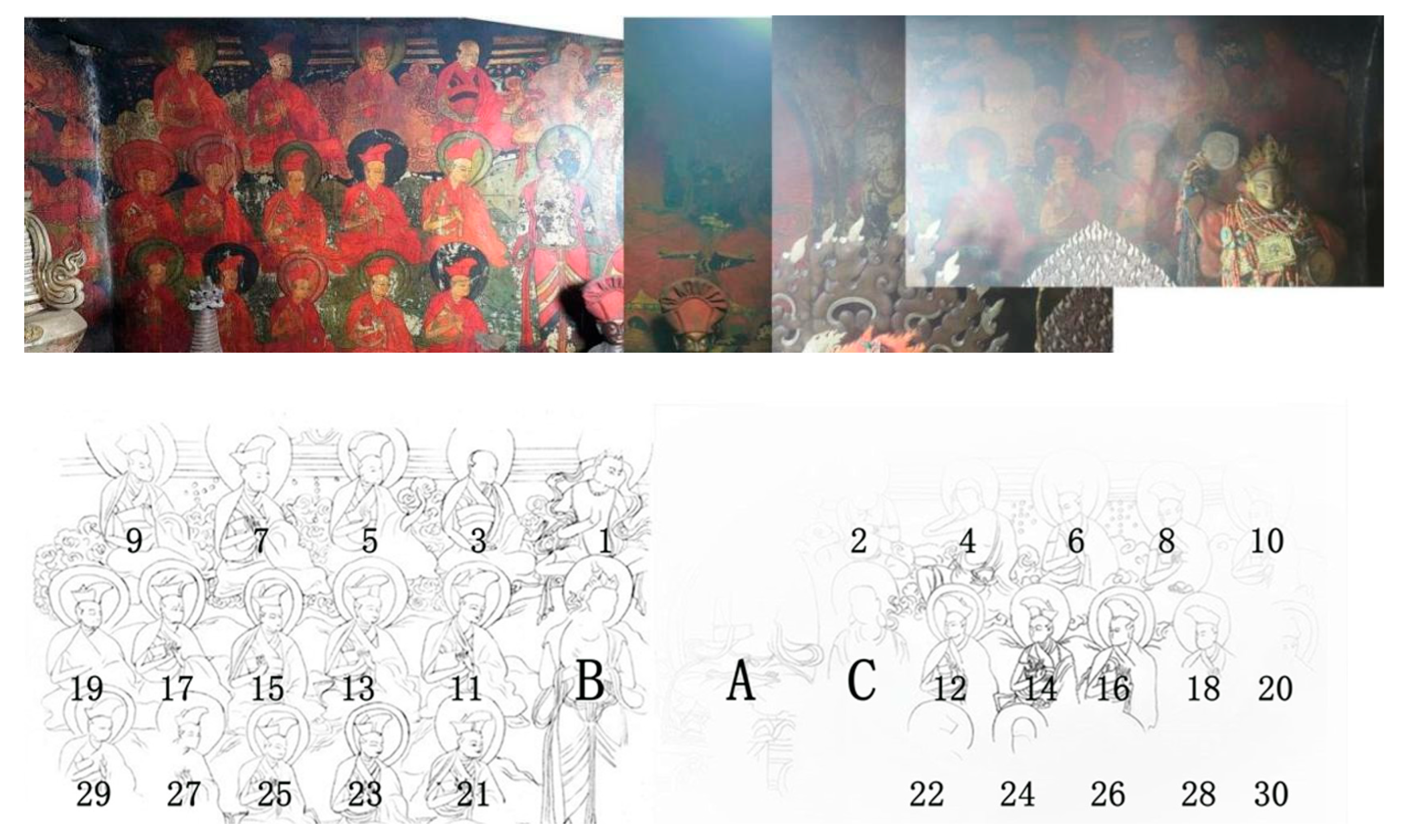 | 2 | Tshe dpag med (verses are omitted), Ma thogs pa ba’i rgyal mo, Attendant Bodhisattva (the inscription is unclear). | Surrounding | 1. Ma gcig grub pa’i rgyal mo. 2. Ti phu pa. 3. Ras chung pa rDo rje grags pa and following masters (twenty-four in total). | Nineteen masters’ inscriptions are legible (omitted). | Lineage of Ras chung snyan brgyud. | |