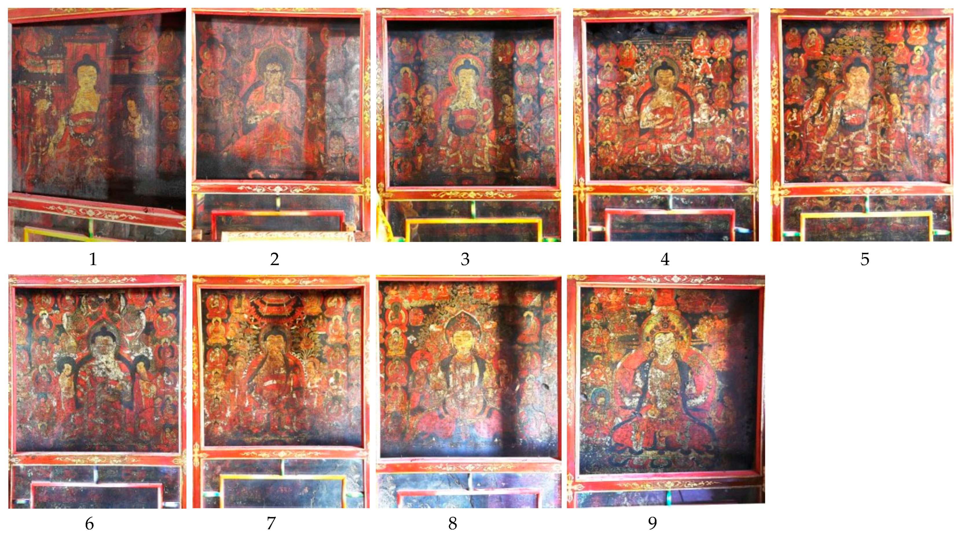 | 3 | 貢不日寺 | mGon po ri dgon pa | Dharma Protector Mountain | The Cultural Relics Records of mNga’ ris Prefecture 阿裏地區文物志 (See Li and Huo 1993, p. 129) Tibetan Buddhist Monastery Mural Art 西藏佛教寺院壁畫藝術 (Tibet Autonomous Region Cultural Relics Management Committee 1994, pp. 162–65) The History of Tibetan Buddhist Painting 藏傳佛教繪畫史 (See Yu 2006, p. 211) |