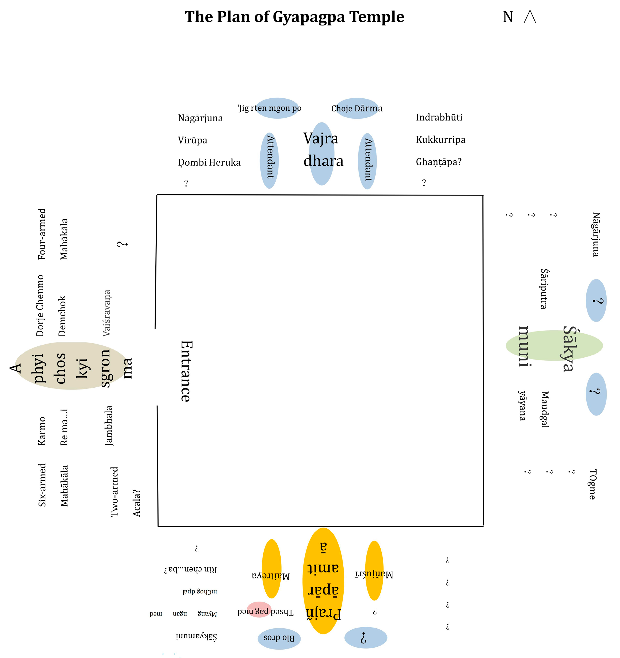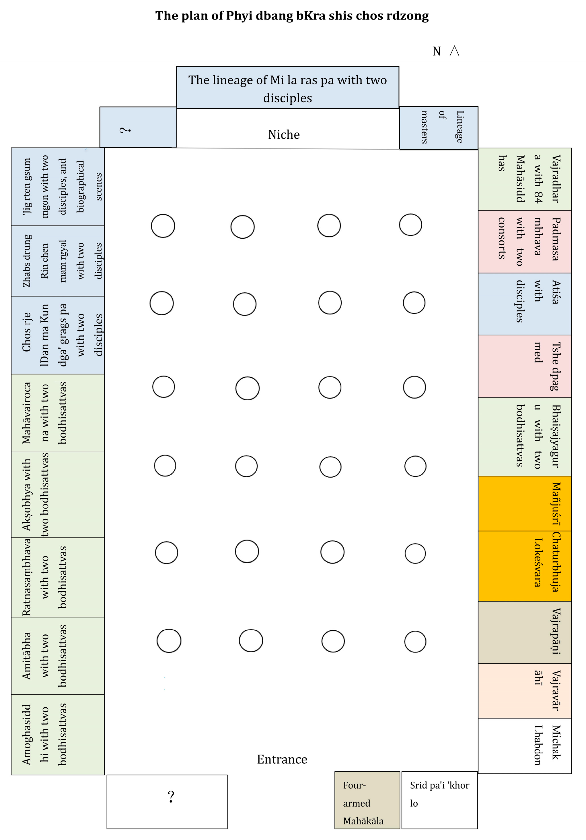| Bottom | Four vidyārājas including gShin rje gshed go ljang. | Two inscriptions are legible (omitted). | ||||
