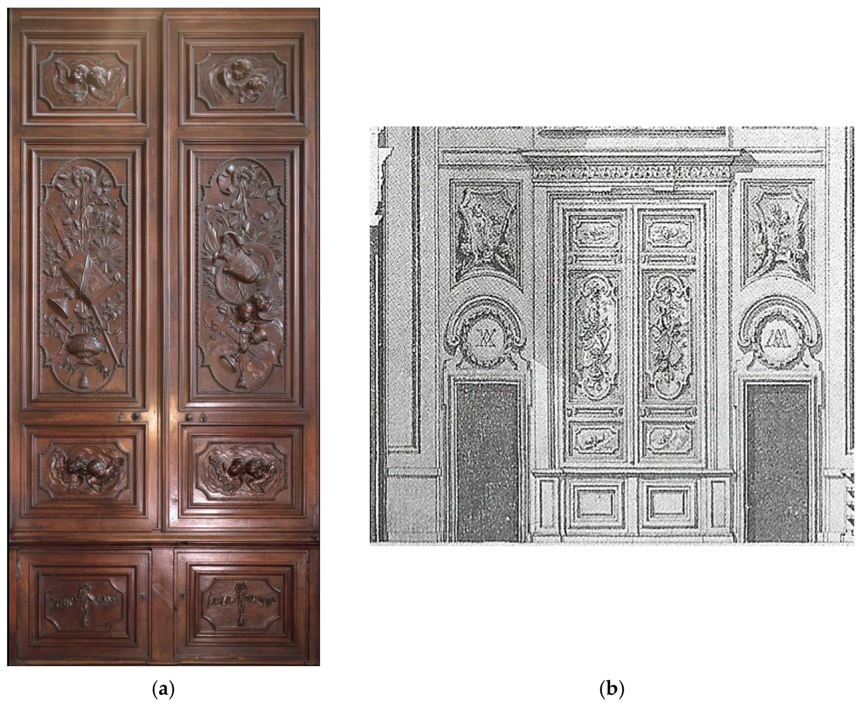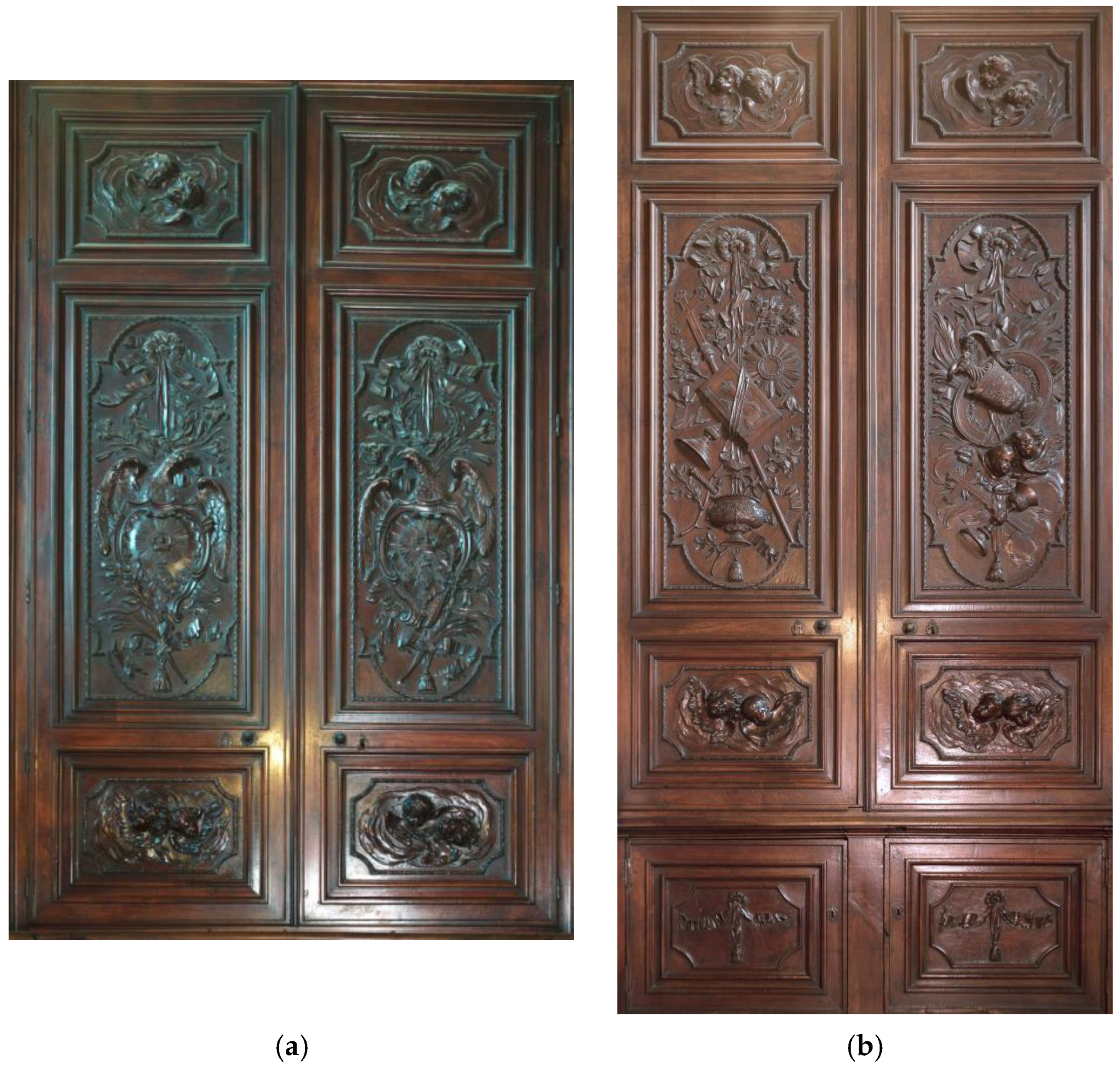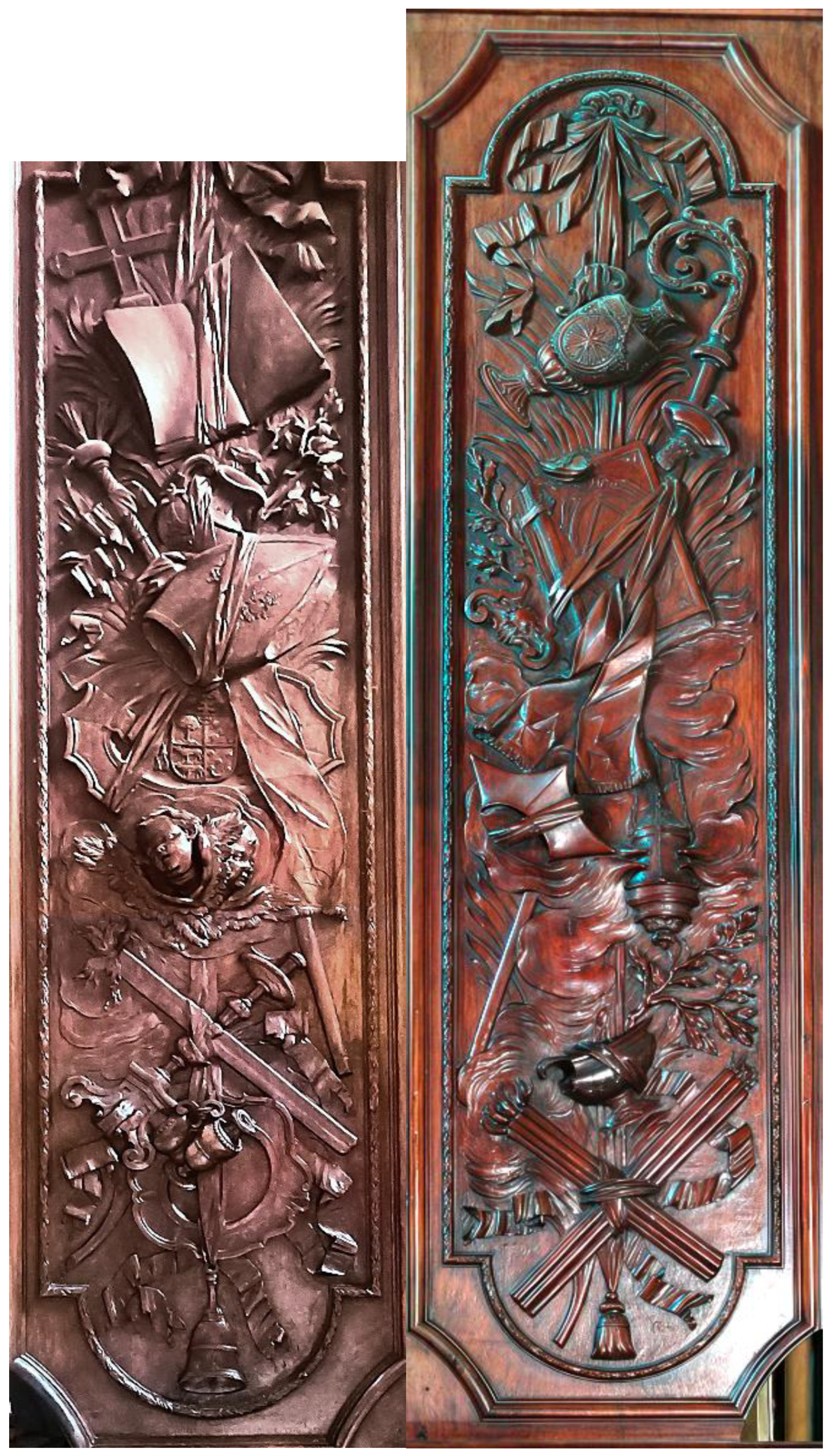 | 11 | Monumental walnut door carved on both sides (approximately 4.56 m high × 2.14 m wide), flanked by a pair of Corinthian columns. The door consists of two leaves divided by a pair of stiles into three panels, decorated with mixed-molded squares containing bas-reliefs executed in the schiacciato technique. |