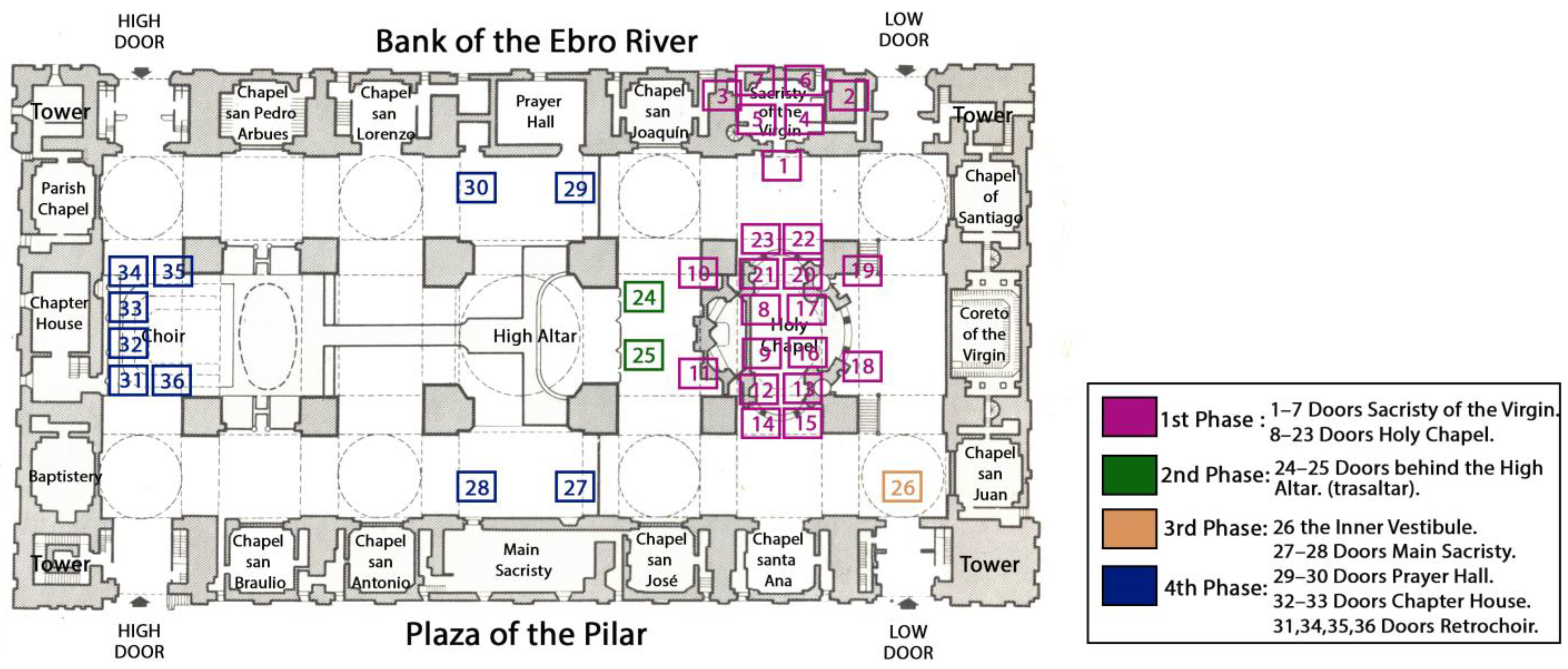 | 10 | Although the doors under study were produced between 1756 and 1760, they constitute the beginning of a sculptural project that extended over one hundred and eleven years, articulated in four distinct phases. The first coincides with the project of the Holy Chapel (1750–1765), resulting from the collaboration between the sculptor José Ramírez and the Royal Architect Ventura Rodríguez as its designer. According to the documents, this initial stage corresponds to the installation of the doors of the Sacristy of the Virgin (1756–1760): the entrance door, those of the cabinets for the Virgin’s jewels and silver, and the four doors of the wall bays; as well as those of the Holy Chapel (1760–1765). The second phase (ca. 1788) plausibly relates to the construction of the two doors of the rear altar. Despite the absence of documentary records, a reference in (Ponz 1788, p. 28) suggests the possibility of their attribution to the sculptor Joaquín Aralí. Subsequently, the third phase comprises the making of the low door screen of the south façade (1846–1850), a work by the carpenter Manuel Sarte and the sculptor José Alegre. Finally, the fourth phase (1866–1868) corresponds to the ten doors mentioned above (Figure 2). This article is part of a broader line of research dedicated to the study of the symbolic development of Marian emblems represented in the sculptural ensemble of the thirty-six doors ornamented with bas-reliefs in the Basílica del Pilar (Ortiz Gutiérrez 2024a, 2024b, 2026). |