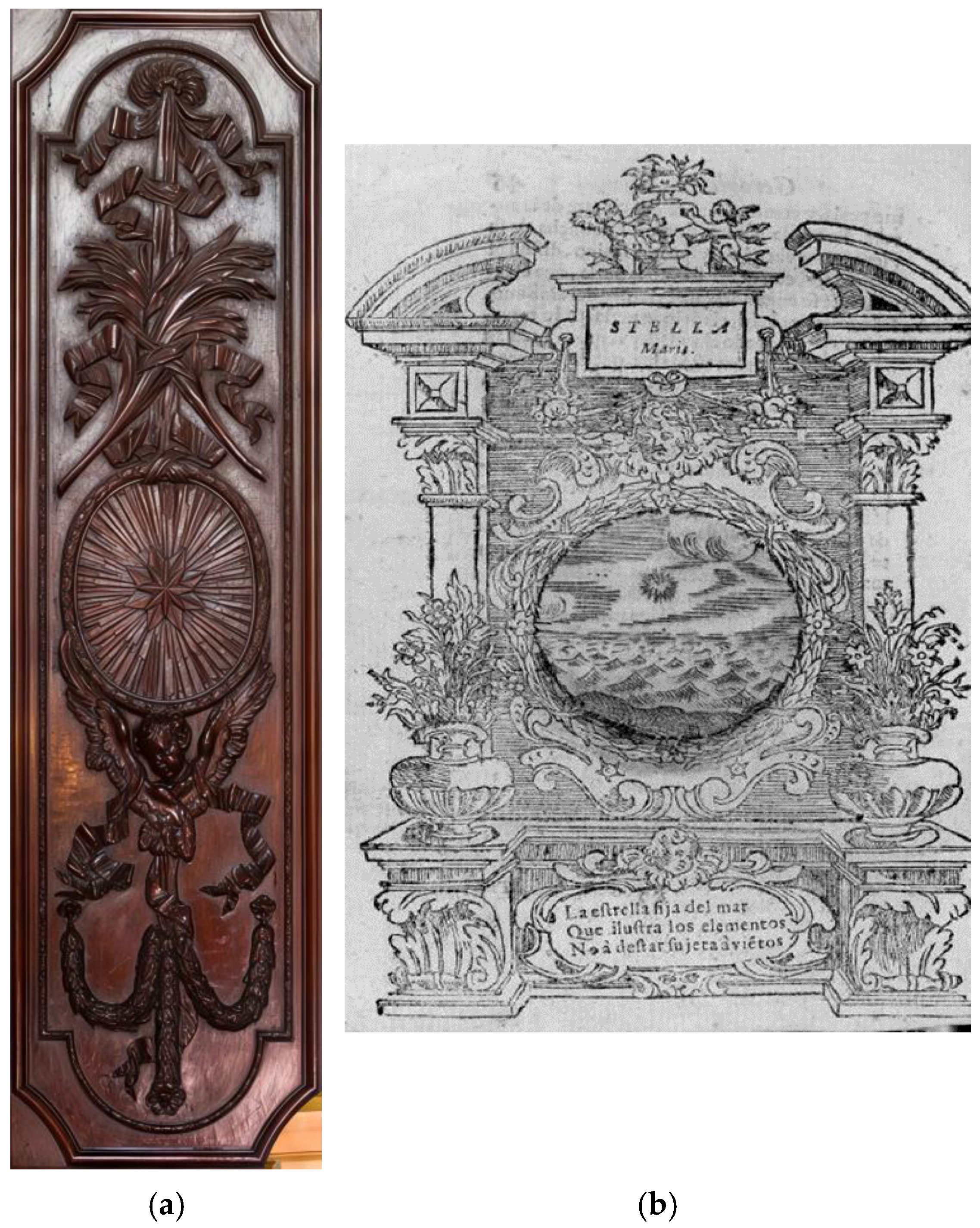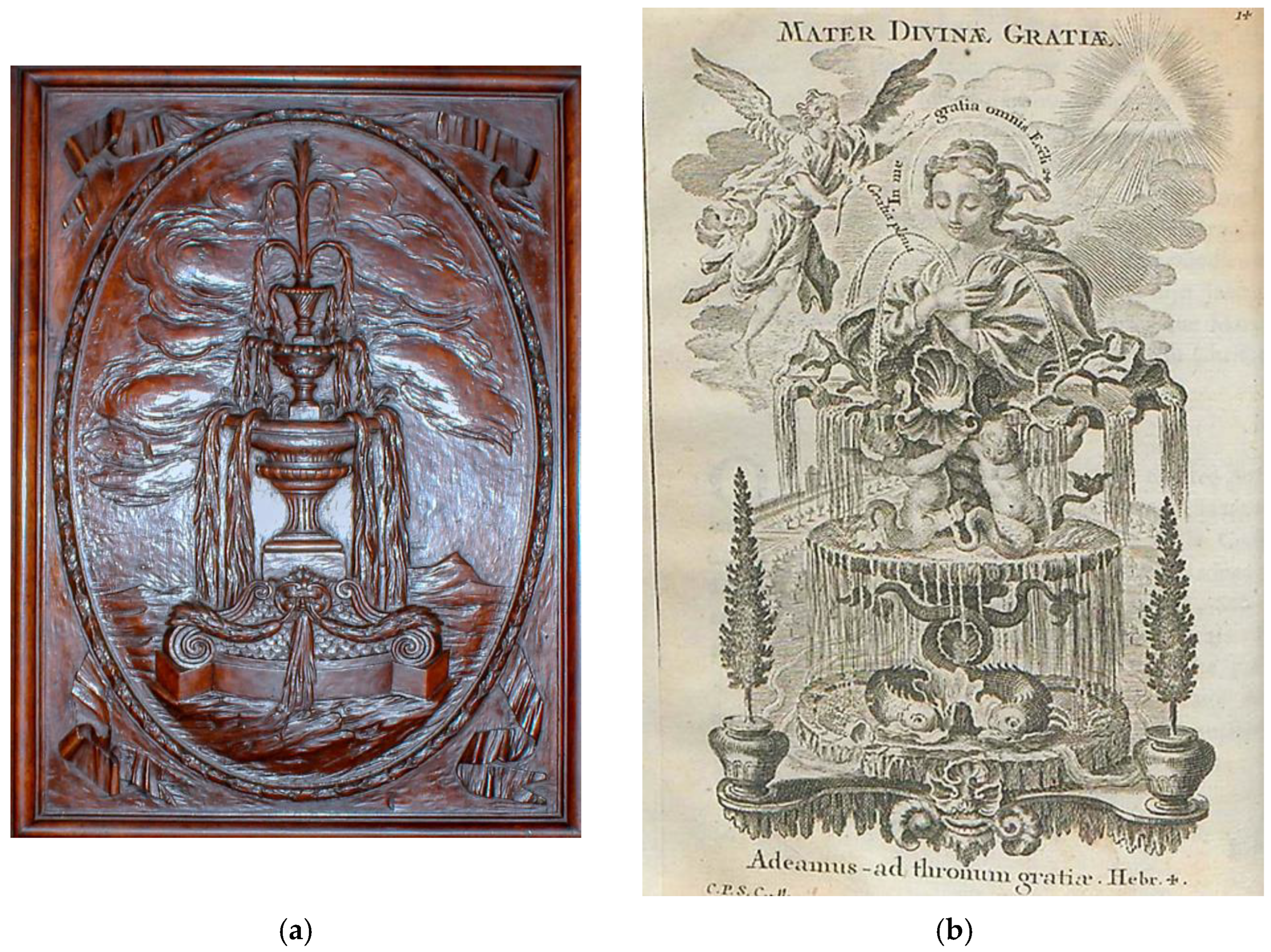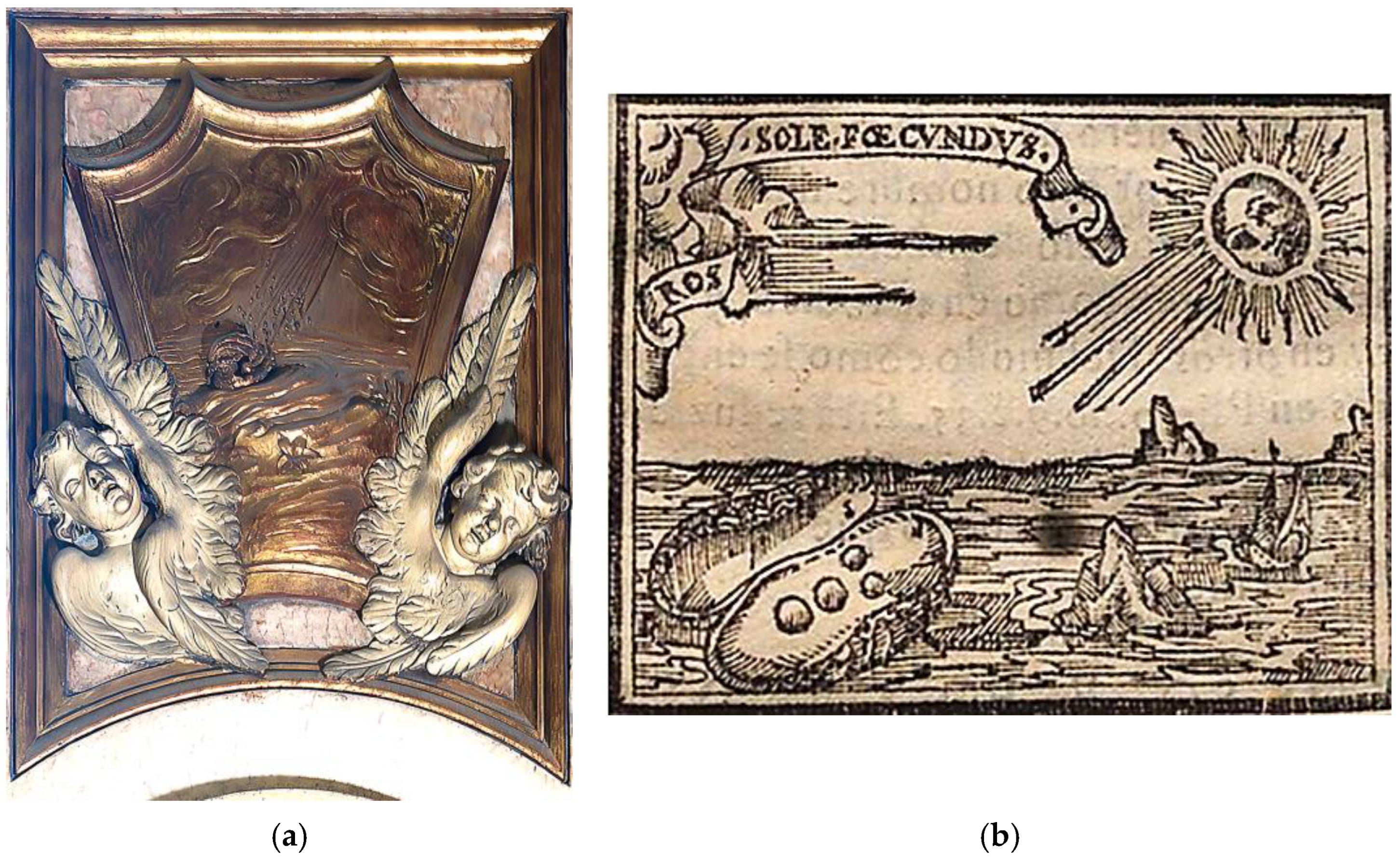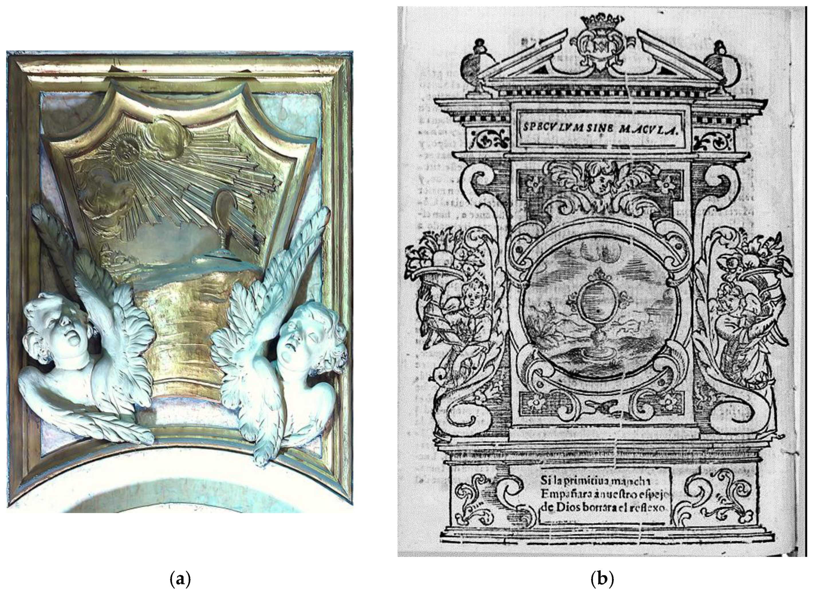 ). The bas-relief it houses constitutes a singularity within the visual program of the Sacristy of the Virgin, as it does not refer to the treatise Flores de Miraflores (De la Iglesia 1659). In it, Mary is represented as the “precious shell,” fertilized by the pure morning dew (Figure 16a).