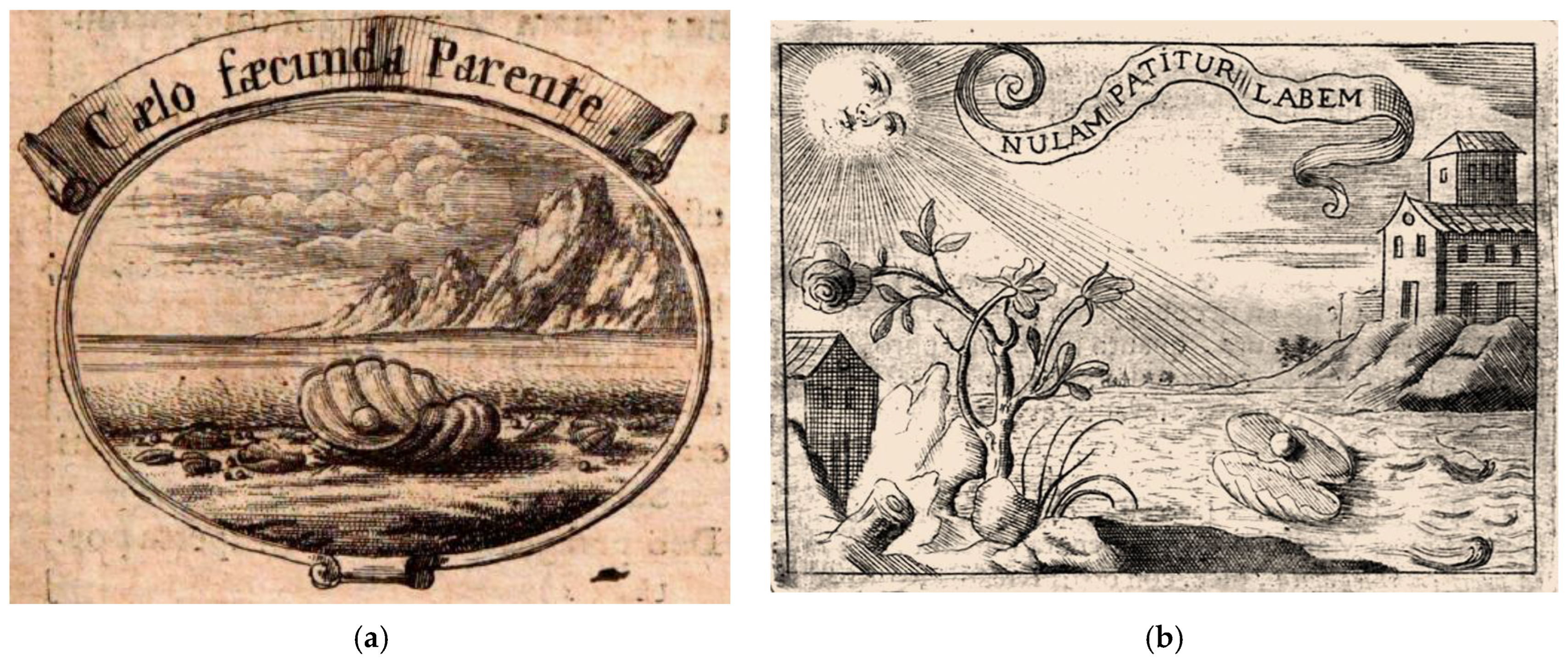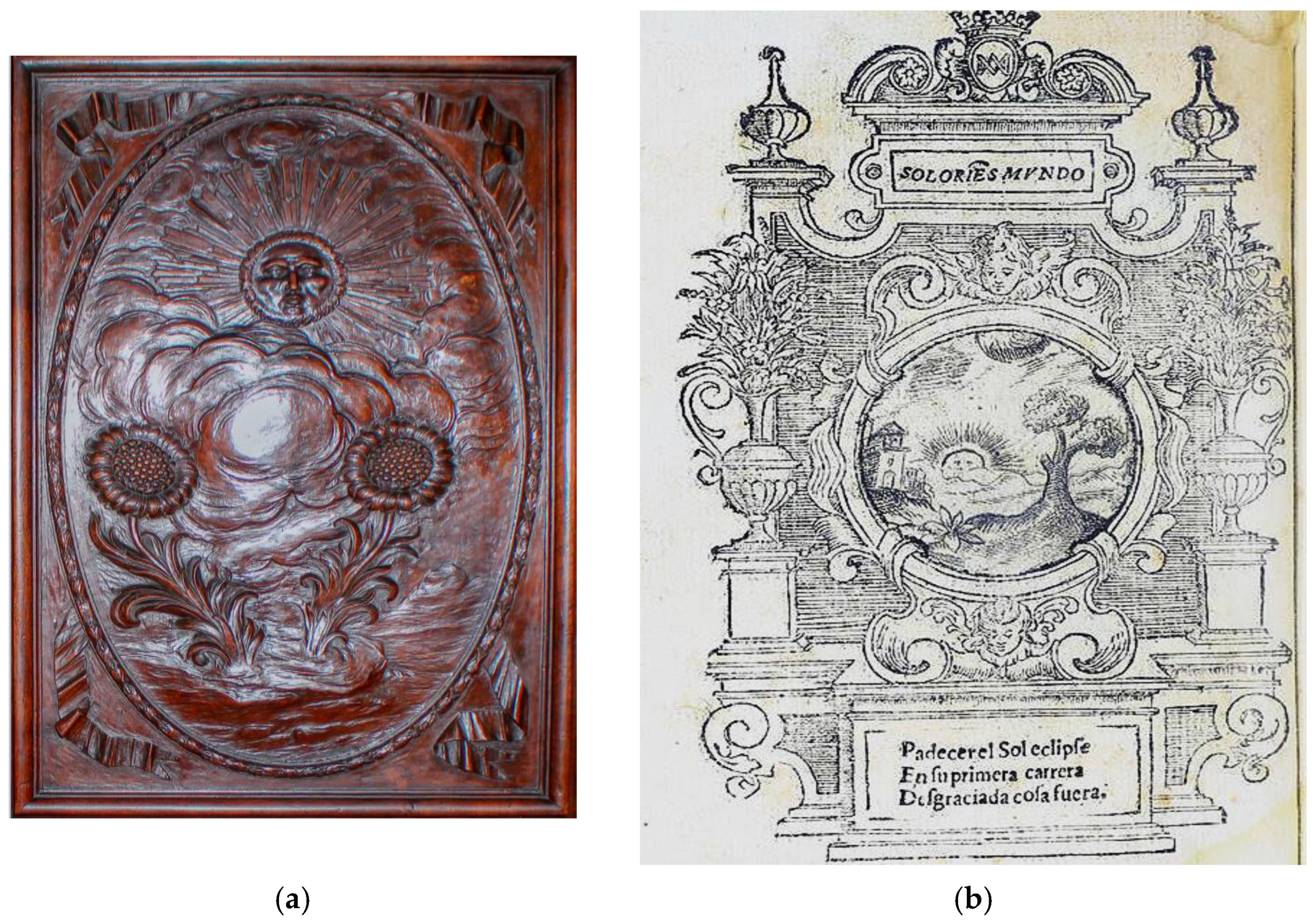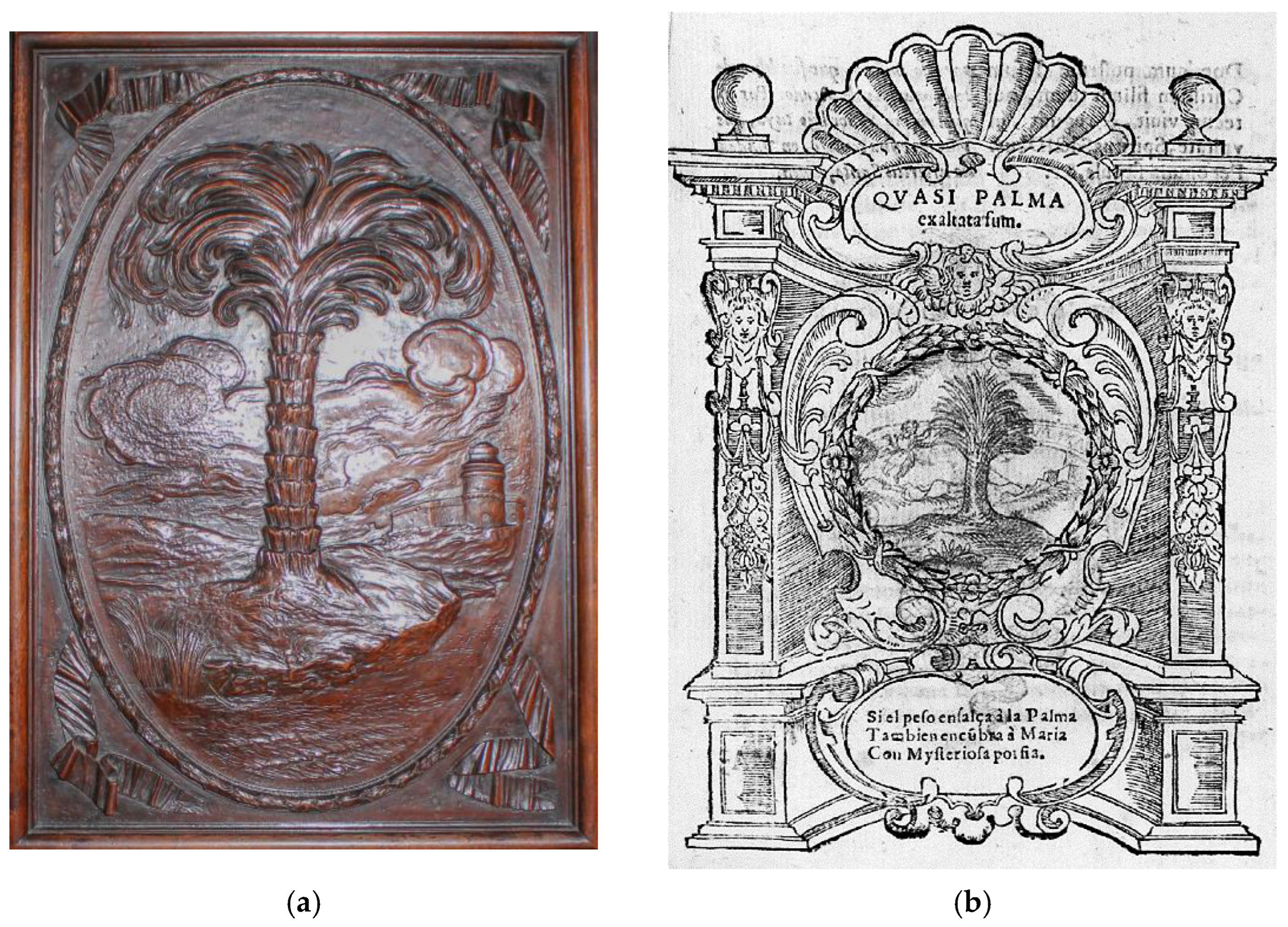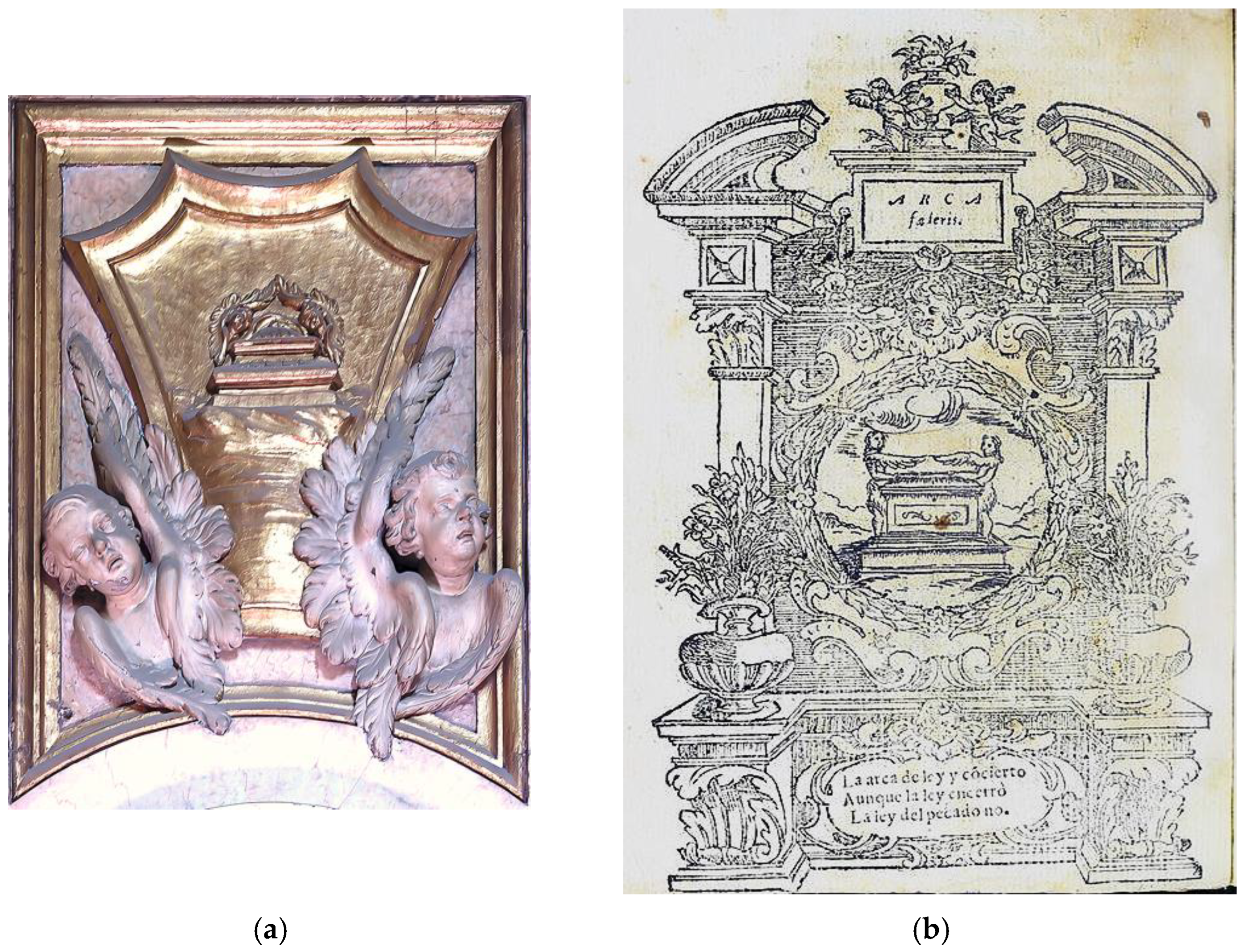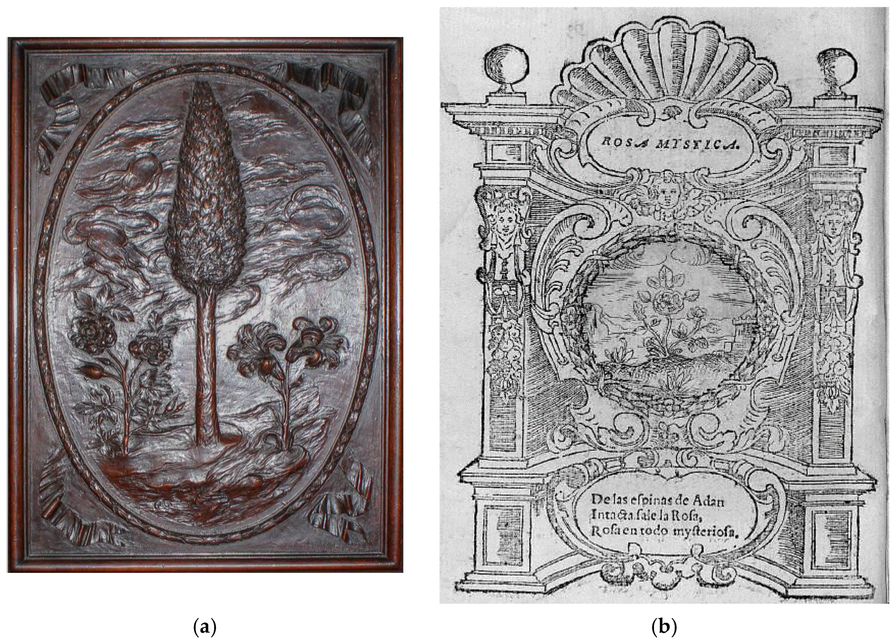 ). The bas-relief it houses constitutes a singularity within the visual program of the Sacristy of the Virgin, as it does not refer to the treatise Flores de Miraflores (De la Iglesia 1659). In it, Mary is represented as the “precious shell,” fertilized by the pure morning dew (Figure 16a).