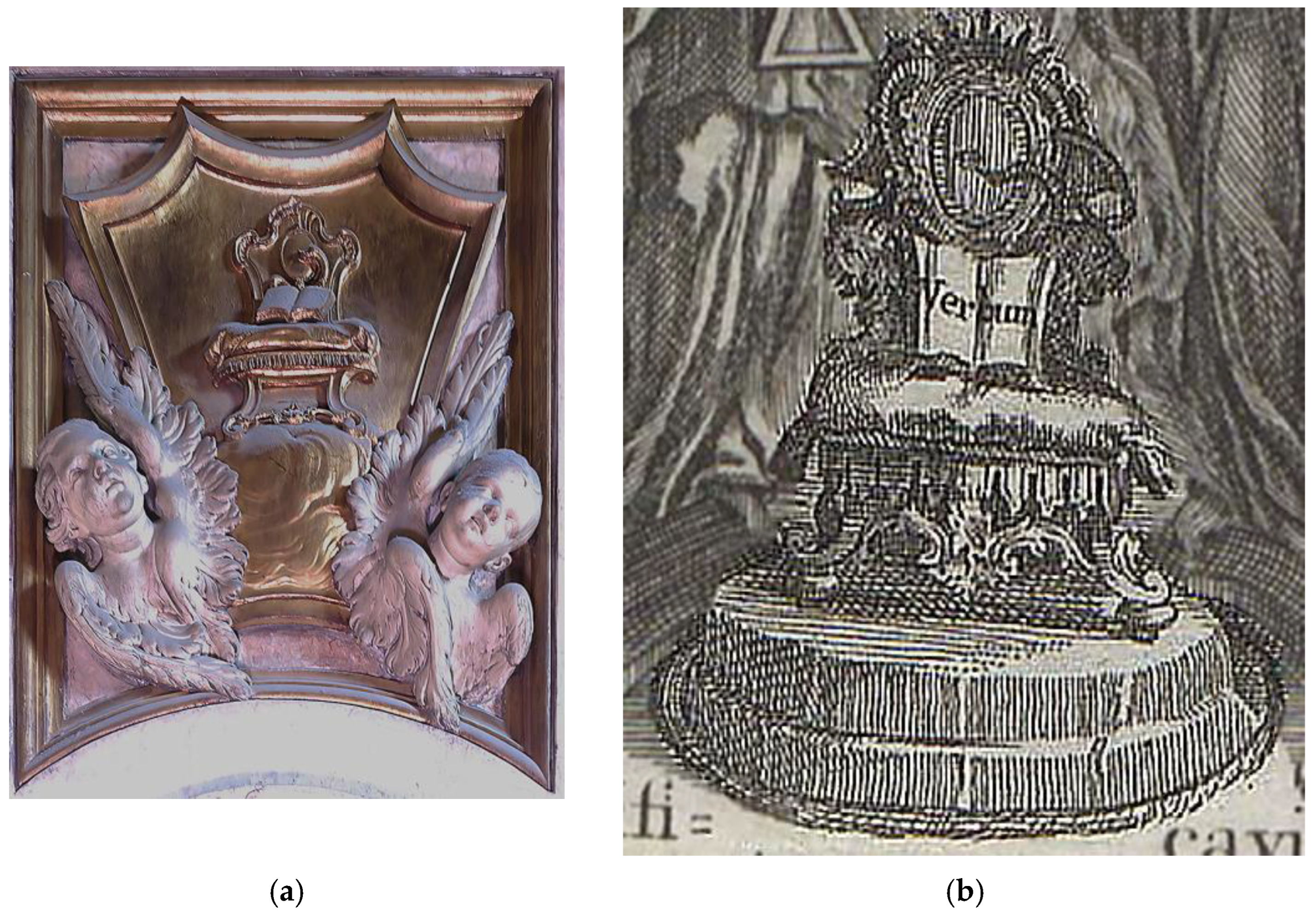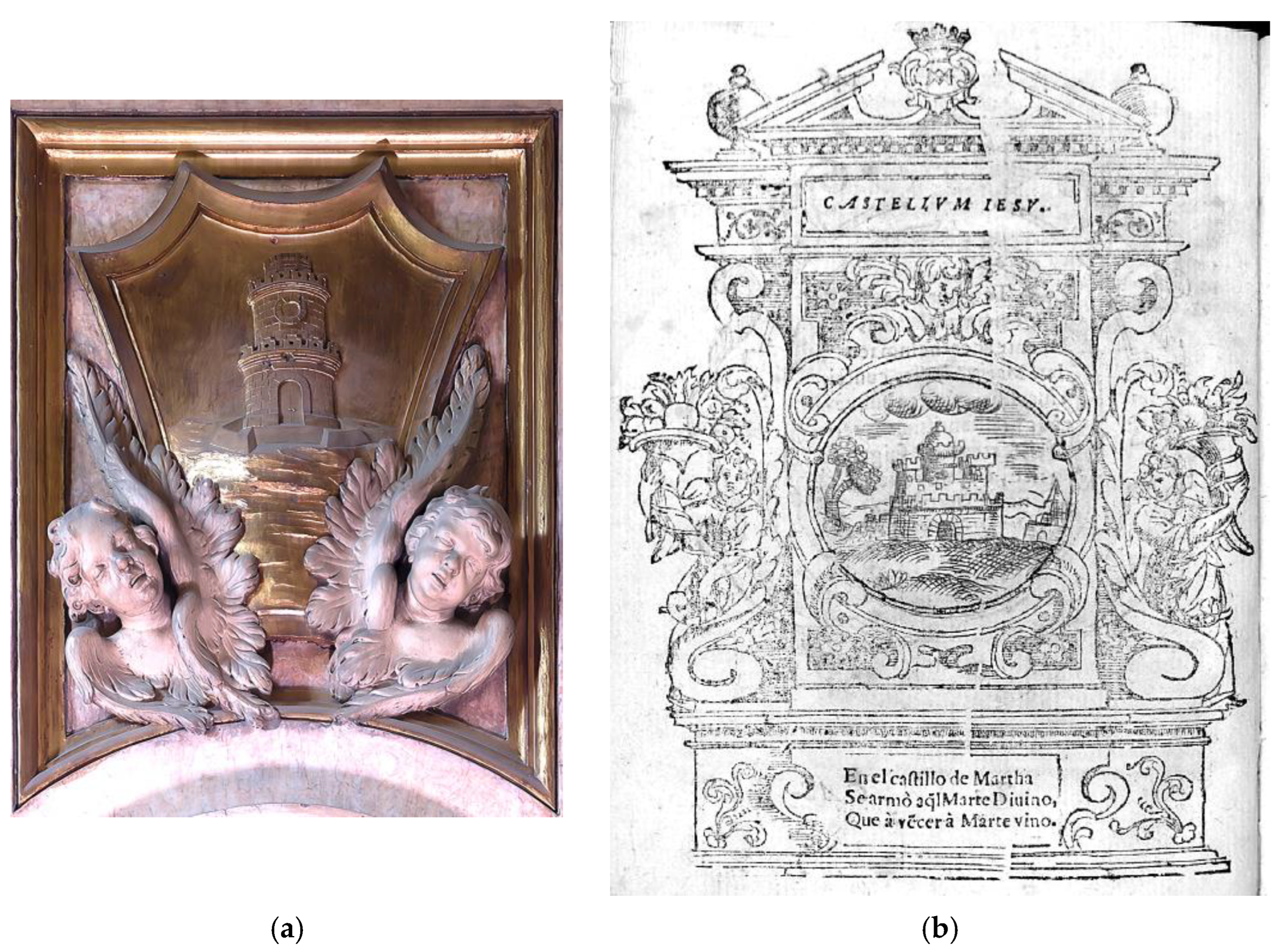 ), adorned with a bas-relief in which an immaculate mirror appears in the foreground, struck by the rays of the Sun of Justice (Christ), which emerges from among the clouds. On the horizon, a small fortified building rises, possibly the walled city of Jerusalem (Figure 15a).