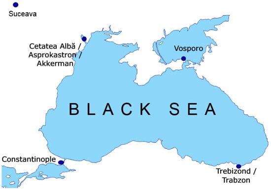 Starting from this chronological adjustment, Matei Cazacu recontextualizes the moment of Saint John’s martyrdom, thereby seemingly resolving the debate over the location of Cetatea Albă//Leukopolis//White Citadel—identifying it not with Asprokastron (Greek)/Akkerman (Turkish)/Belgorod-Dnestrovskiy in the western Black Sea, but with Vosporo, a port near the Cimmerian Bosporus (the Strait of Kerch) (Năsturel 1971, p. 347). For better geographical orientation see Figure 1.