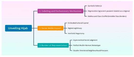 As a result of analyzing the interviews with the participants, certain themes emerged. The factors affecting the decision to abandon the hijab were grouped under three main themes: the influence of social media, labeling and exclusionary mechanisms, and the burden of representation. Following the coding process, various sub-themes were developed based on these main themes. Information on the themes is shown in Figure 1.