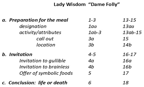 Composed as the conclusion to the prolog, Proverbs 9 is set as a diptych summarizing the basic choice before a young man—the old Deuteronomistic choice for life or death (Dt 30:15,19) now recast as a choice for wisdom or folly (Clifford 2016, pp. 2–3). On one side of the diptych is the sumptuous, carefully prepared banquet of Lady Wisdom (9:1–6); on the other is the enticing but fatal promise of “Dame Folly” (כְּסִילוּת אֵשֶׁת, literally, “the woman of folly”) to provide a meal of “sweet stolen water” and “tasty secret loaves” (9:13–18). He who is simple or naïve (פֶתִי) and accepts the invitation to Lady Wisdom’s banquet (9:4) must “forsake ‘stupid things’” (literally, “simple” or “naïve” things or persons: פְתָאִים, 9:6). Only in this way, he “will live” (וִחְיוּ) and advance along the way of “understanding” (בִּנָה). If, on the other hand, he accepts “Dame Folly’s” invitation, he will naively enter a tomb from which he will never leave: “He does not know that the shades of the dead are there, that her guests are in the depths of Sheol” (Prov 9:18; cf. 7:27). The invitations of Lady Wisdom and Dame Folly each appear attractive; a mature discernment is required to make the choice that leads to life. In fact, as Bruce Waltke points out (Figure 1), the invitations of the two very different ladies are nearly identically structured: