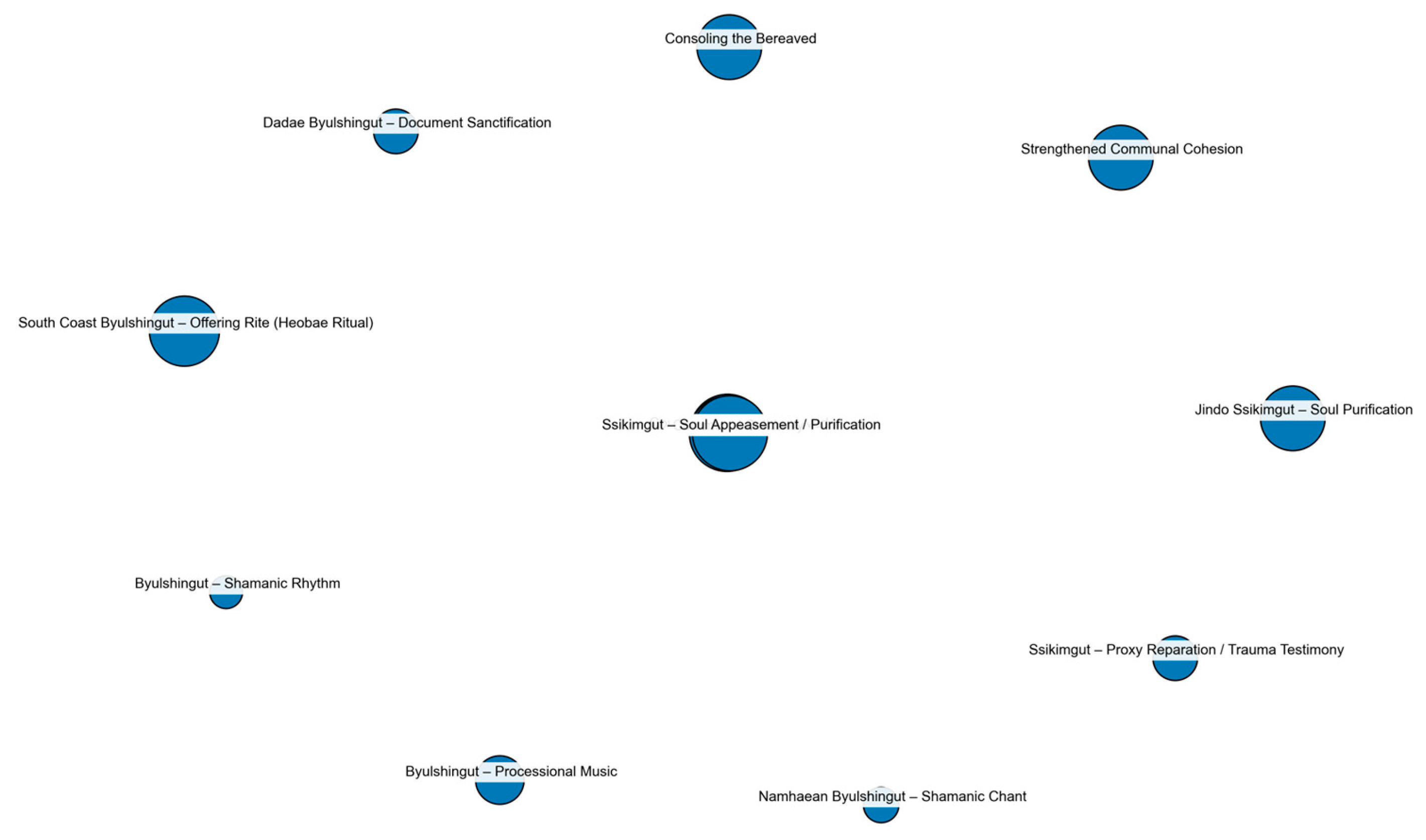The results reveal a tightly coupled semantic cluster: signifiers centered on community solidarity, consolation of the bereaved, and Gwakmeori Ssitgim-gut exhibit high co-occurrence within the Ssitgim-gut sample (φ > 0). In contrast, exhibition-oriented signifiers, such as Namhaean Byeolsin-gut_ollim mugwan, are significantly concentrated within Byeolsin-gut events.