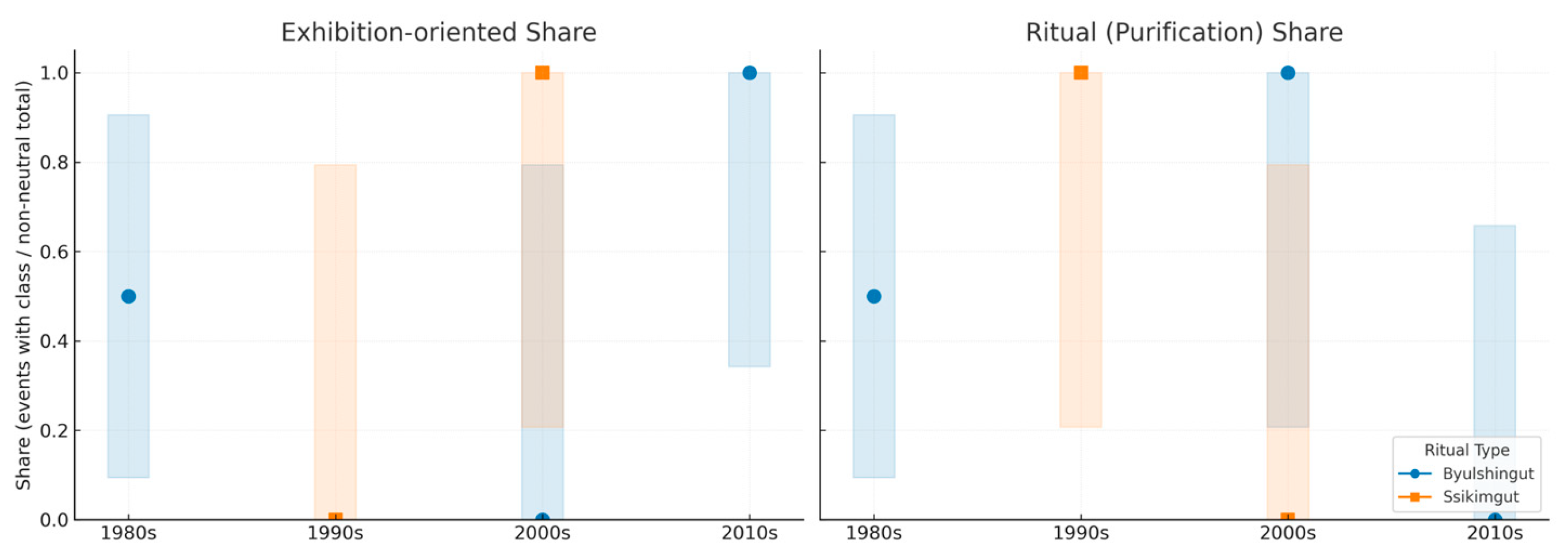 The event distribution further reveals a clear typological differentiation. Byulshingut events are concentrated in the I = 2–3 range, with relatively low ΔP_S values, indicating a dual-polar structure involving institutions and the community. In contrast, Ssikimgut events cluster in the I = 0–1 range, where ΔP_S remains high and the ritual retains a shaman-centered iconic structure. The divergent trajectories of the two ritual types within the I–S space are fully consistent with the historical and policy analysis presented earlier.