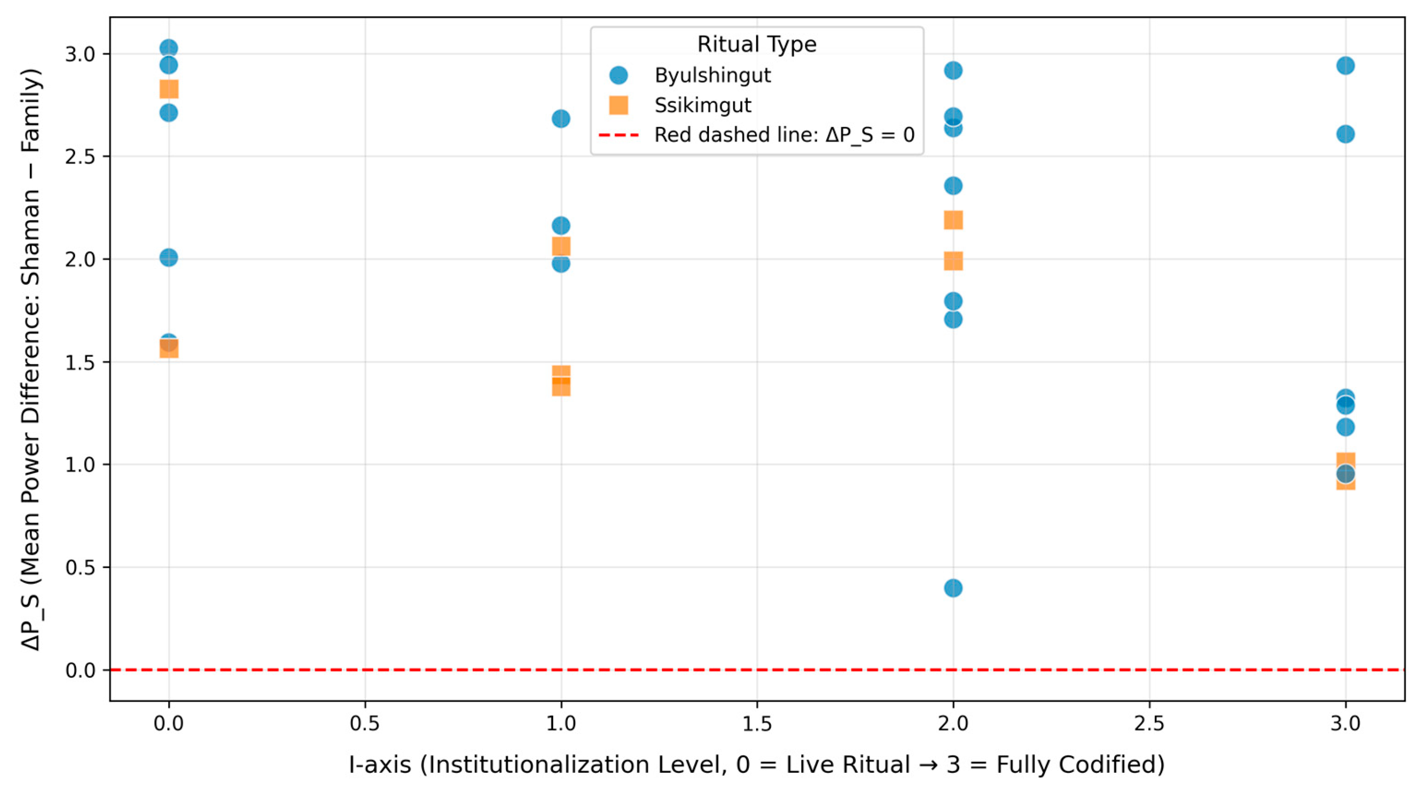 Figure 4 illustrates the event-level distribution of ΔP_S along the I-axis. The fitted trend line exhibits a clear negative association, indicating that as institutionalization increases from I = 0 (non-scripted) to I = 3 (fully textualized), shamanic symbolic dominance no longer remains exclusive. Instead, the symbolic power of family members and the community gradually increases, with ΔP_S converging toward zero. This pattern reflects a transition from a unipolar power structure to a coordinated, multi-actor configuration. The downward trend closely corresponds to the matrix analysis presented in