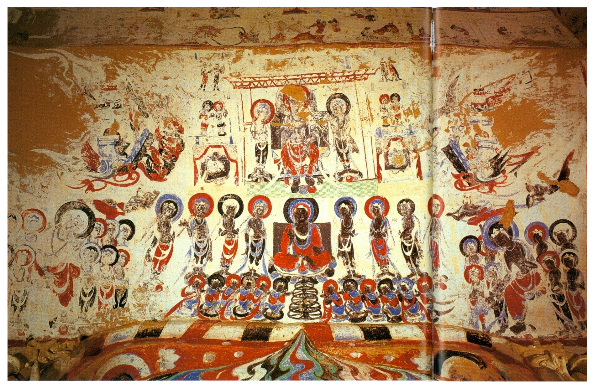 - Locations: (1). The earlier three are depicted on the ceilings of the niches on the west wall while the last one is painted on the east wall. (2). The variation in sizes and height of the representations indicates the development phase of this theme in Dunhuang.