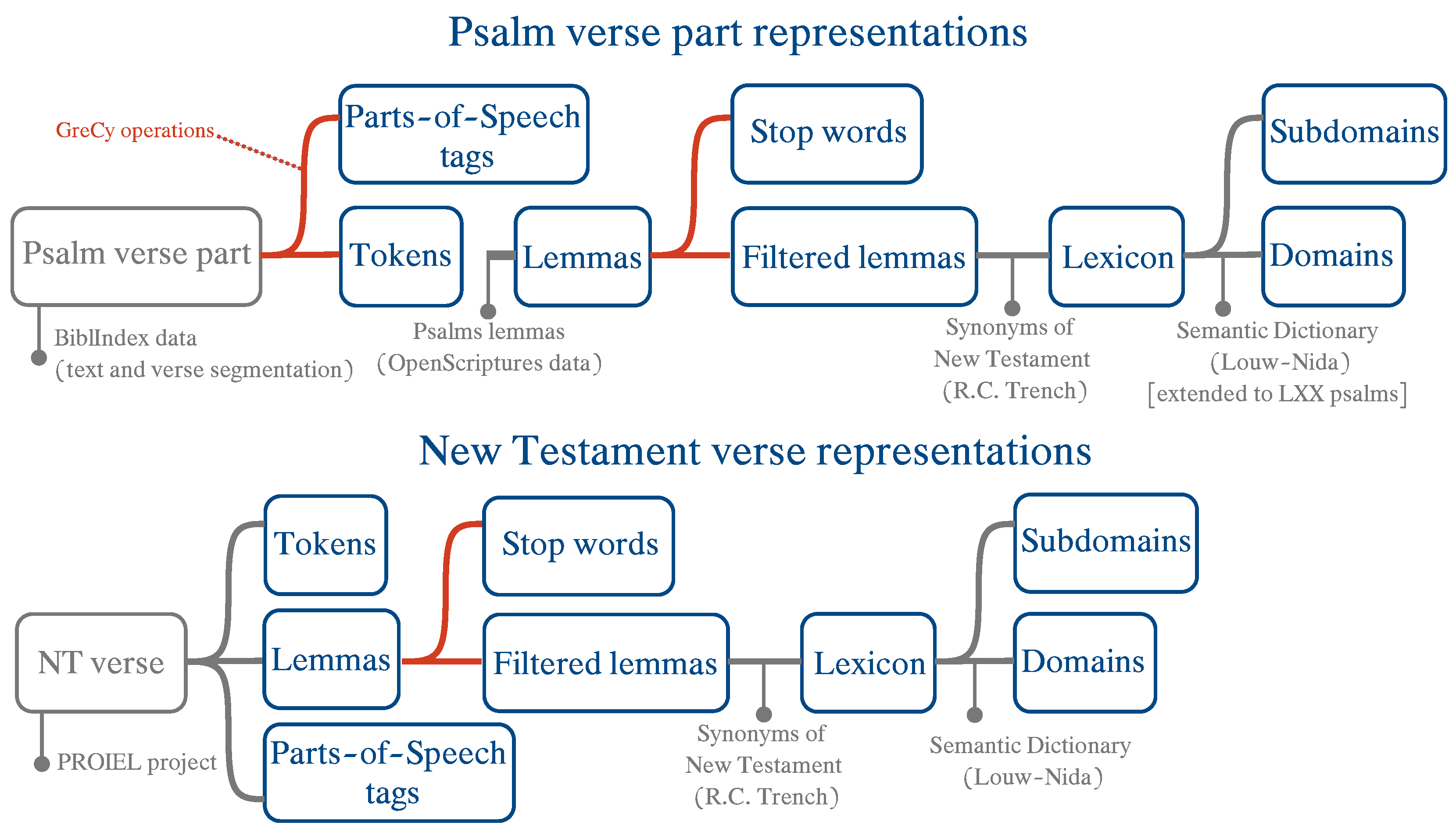 Figure 2 presents an overview of the elaboration process of the two datasets (the New Testament and the Psalms), summarizing the operations, integration of external resources and application of GreCy. Note that, at this stage of our analysis, the data are strictly textual (no numerical values) and can thus be interpreted and reviewed by individuals without digital tool expertise. Complete versions of our New Testament and Psalms datasets (including the lemmatized NTG text) are available on the project GitHub