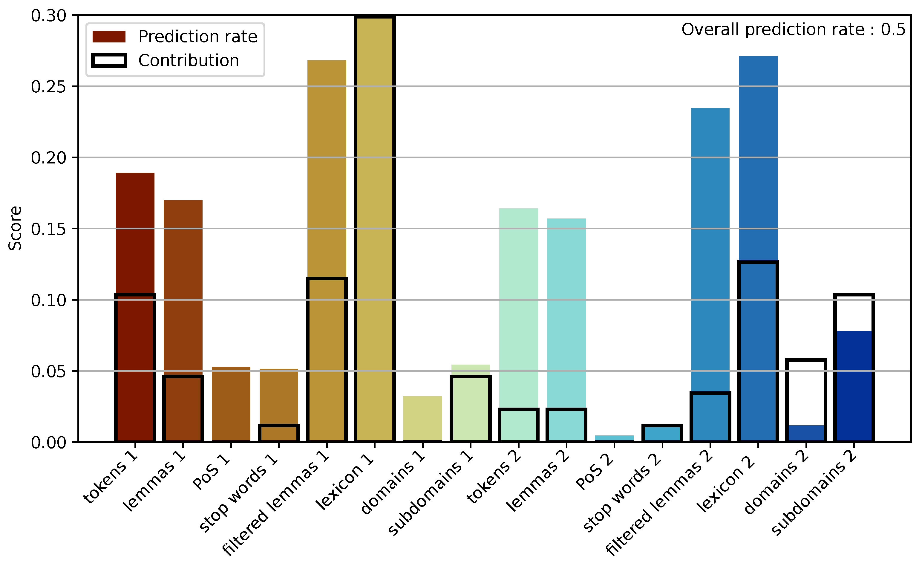 Finally, we note that the prediction rates are quite low. The highest value is approximately 0.3 and only eight of the 16 bars are greater than 0.1. However, the overall prediction rate–i.e., the ratio of correct predictions from all representations–reaches 0.5. This means that reuse predictions are not achieved by a single representation. The contribution score aims to measure the impact of each representation on the overall prediction rate.