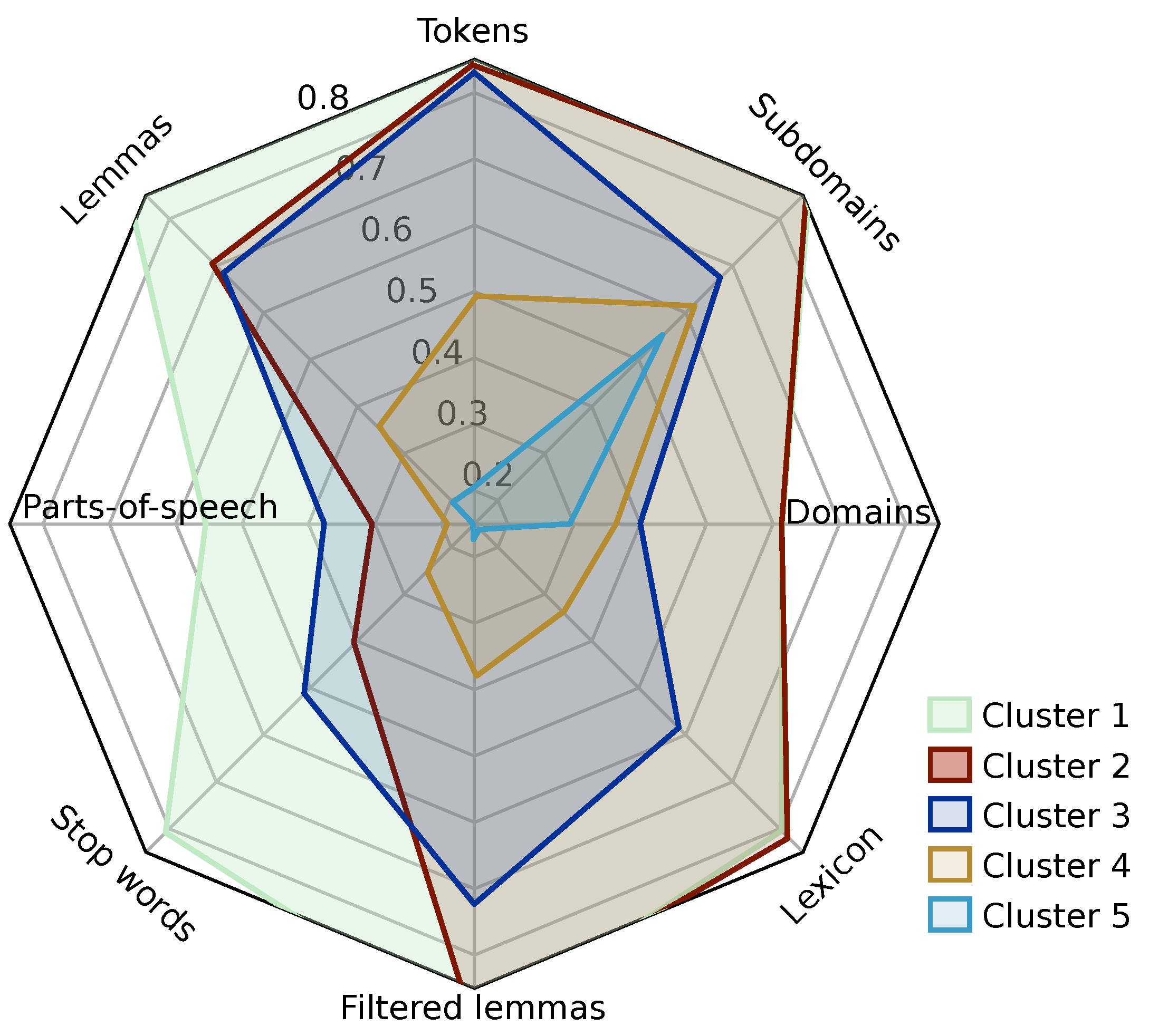 Figure 7) to compare the values and shapes of the five clusters for a given normalization. Regarding normalization comparisons, normalization 2 is clearly more sensitive to differences between reuses because the shapes of the clusters diverge much more than they do with normalization 1. Although normalization 1 produced significantly better prediction results, normalization 2 is nevertheless more suitable for characterization. For clarity, we chose to only present normalization 2 radar charts. As expected, cluster shapes decrease as the proportion of literal reuses increases (from cluster 1 to cluster 5). We also found that
