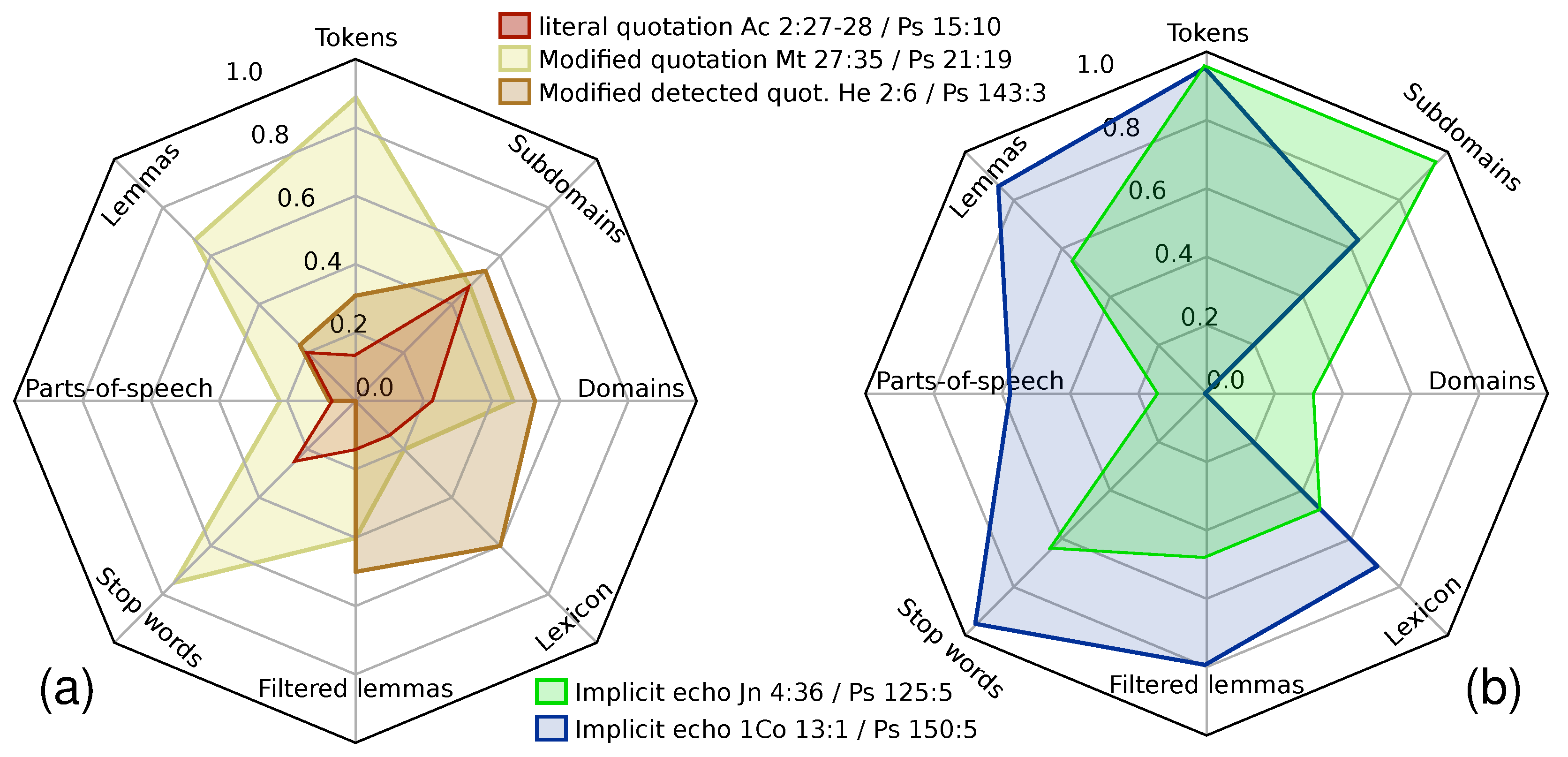 Quotations exhibit very low values compared to echoes. We observe a quantitative difference between our three quotations. The literal quotation of Psalm 15:10 found in Acts 2:27–28 has lower values than the two modified quotations, except for the stop words value, which is lower for the detected quotation because of its length and the high number of common lemmas.
