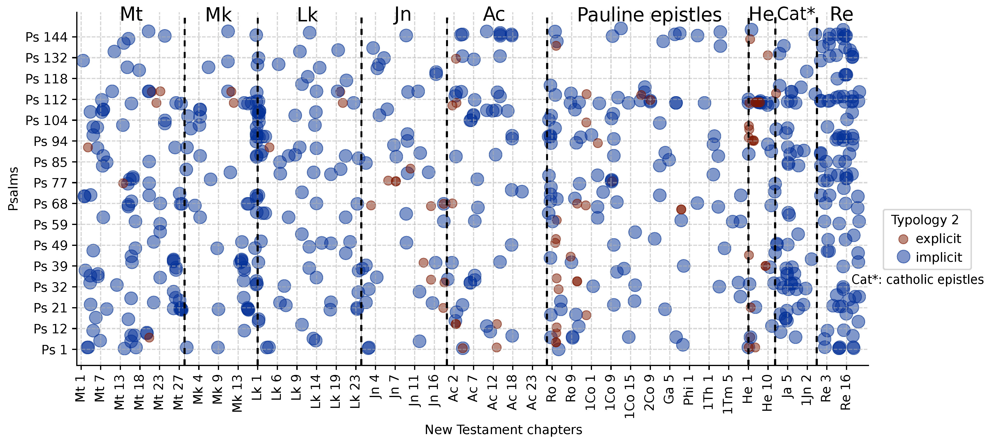 We created a map that illustrates the locations and types (typology 1) of all the reported and categorized reuses of Psalms in the New Testament (NT), which originate from literature (see