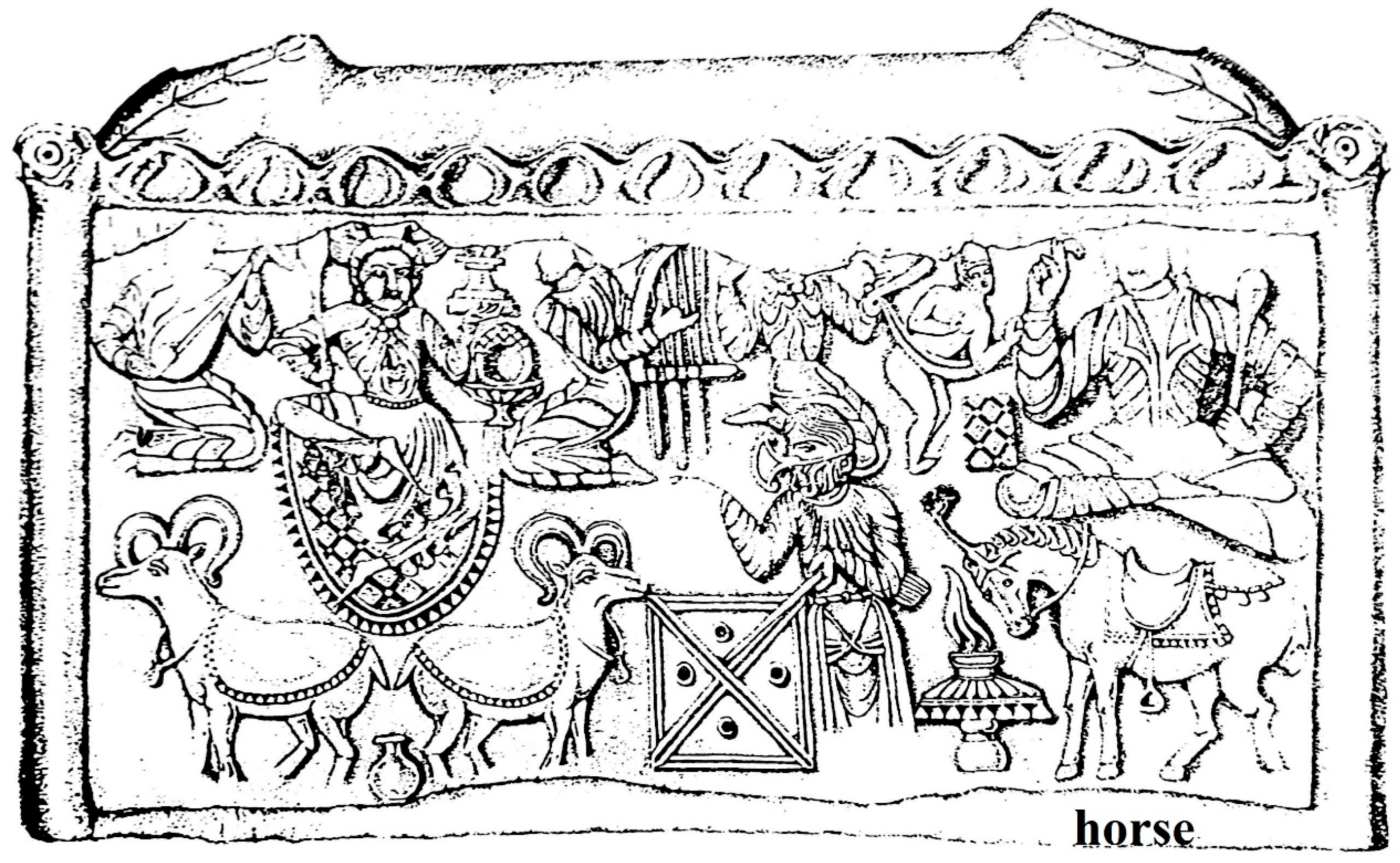 Figure 2). Moreover, he has a long beard and hair. In the upper-left corner of this funerary scene, there is one desperate person who is conducting a riderless horse, possibly destined to some kind of sacrifice (