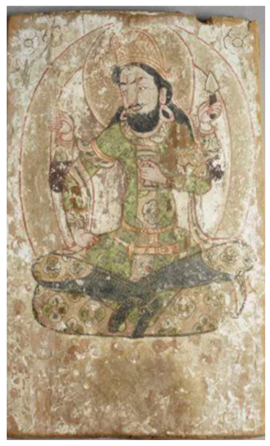 Compareti 2020, pp. 108–10). However, the mural painting could only reveal that the deity had a beard. There is, unfortunately, no inscription nor other hints to propose any identification for this deity that does not seem to belong to the Indian milieu, as is obvious to expect in Buddhist art. This god is not multi-armed either, such as in the case of the so-called “god of sericulture” that embellishes at least six other wooden tablets from Dandan Oilik (