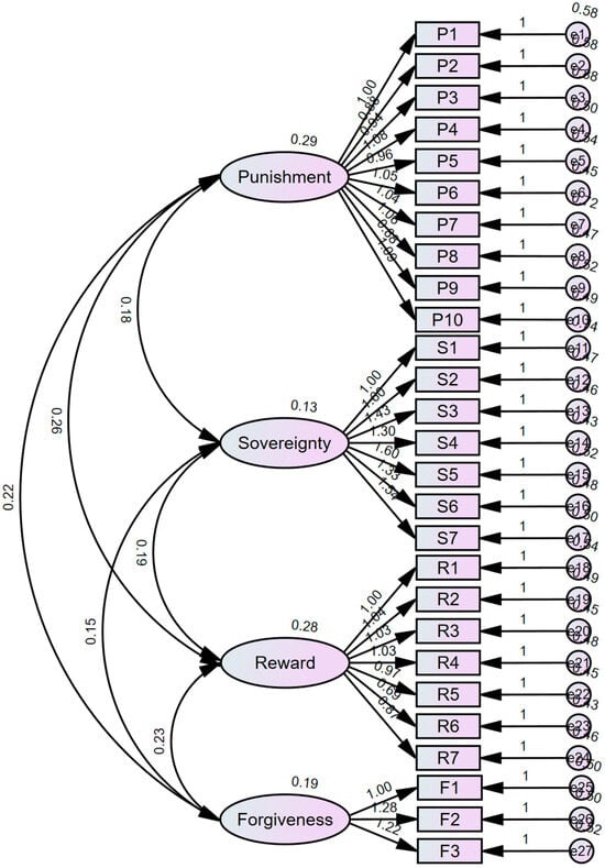 Exploratory Factor Analysis. A subsequent EFA was conducted on the remaining 27 items. The results (see Table 3) revealed four factors with eigenvalues exceeding 1, which collectively accounted for 63.527% of the total variance. Based on the factor loadings and conceptual alignment, the four dimensions of the CBJWS were identified as God’s Punishment, God’s Reward, God’s Sovereignty, and God’s Forgiveness. The assignment of items to each dimension and their corresponding codes are presented in Table 4.