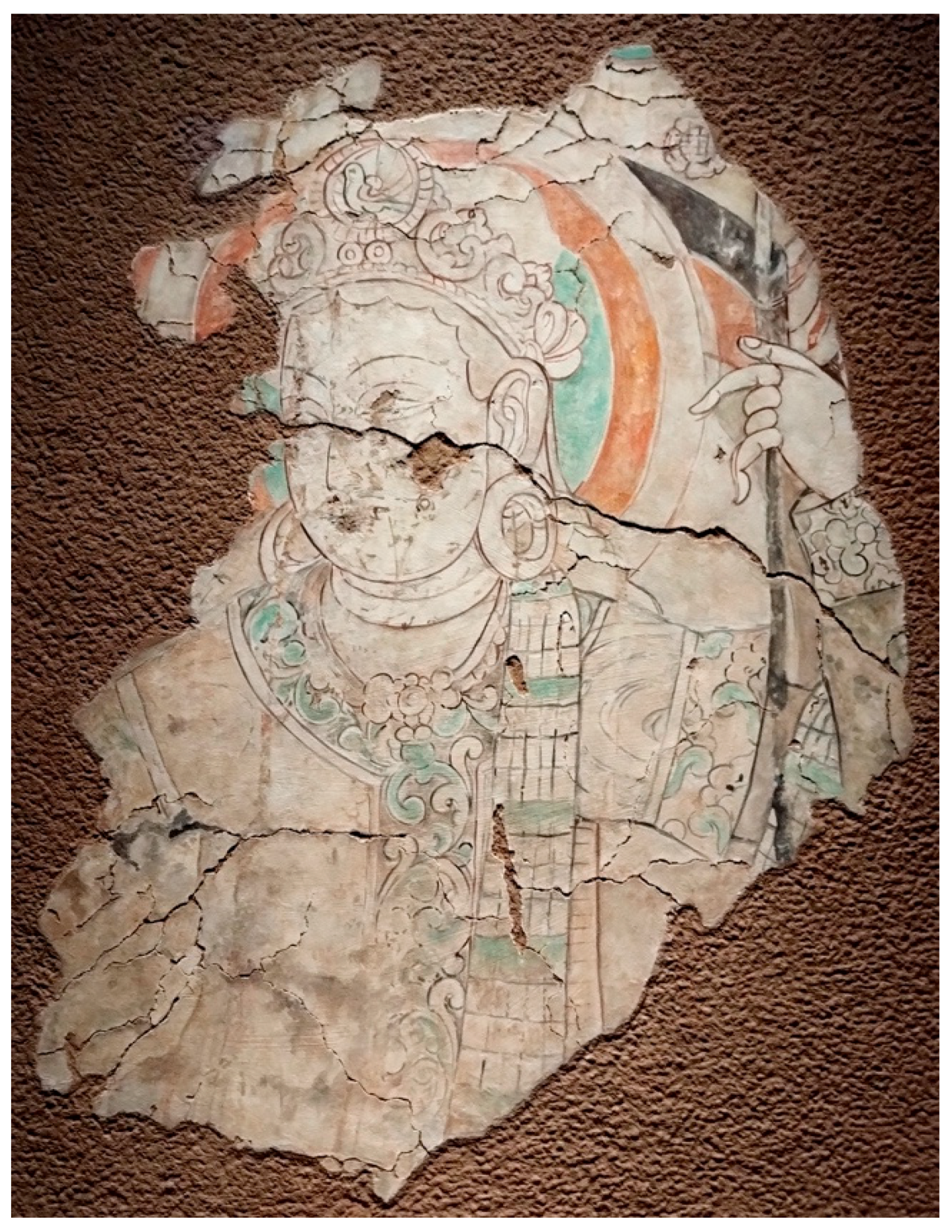 What was represented below these deities has largely been lost, aside from some fragments depicting lay figures. These figures are rendered on a larger scale than the deities above and include an individual with an elaborate head ornament, likely denoting high status. No fragments attributable to images of Buddhas or bodhisattvas were found.