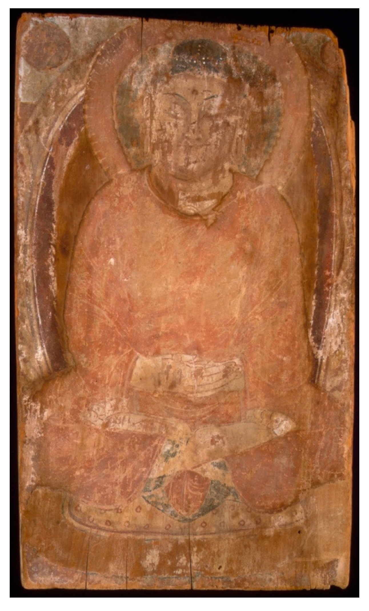 Alongside murals, the corpus of Khotanese painting includes painted wooden panels, which are typically rectangular with a triangular top. These were intended as votive offerings and placed in front of principal sculptures in temple shrines. Often, both sides of the panels were painted, typically depicting Buddhas, bodhisattvas, or deities, and occasionally scenes with a narrative