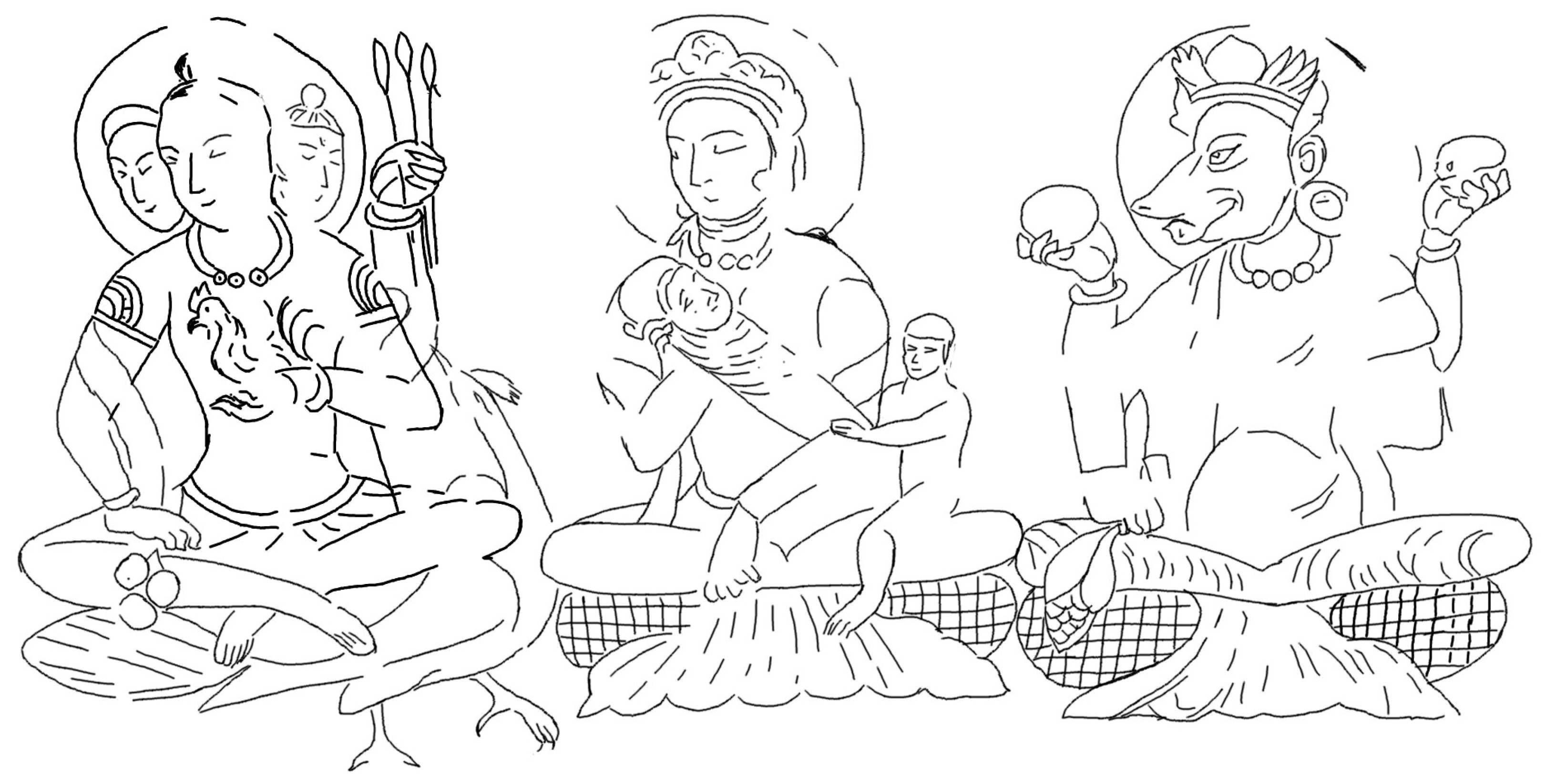 Figure 6). Female figures, such as the goddess Hārītī, as well as animal-headed female beings, also appear. This is most likely connected to the ancient South Asian worship of