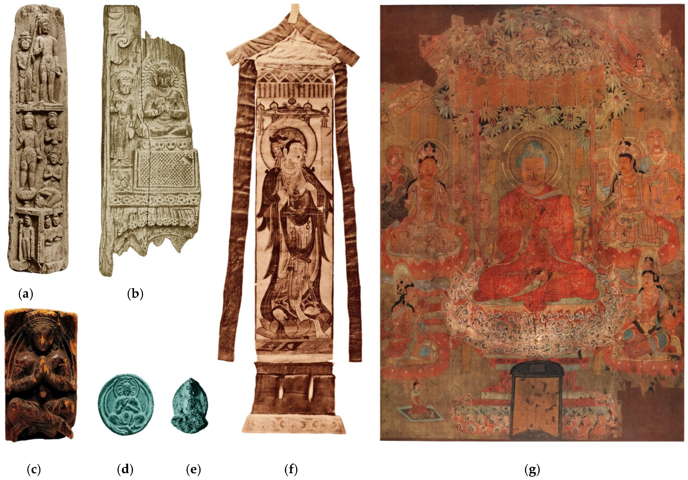 - Dunhuang Museum, ed. 2017. Illustrated Catalog of Precious Cultural Relics in Dunhuang Museum. Shenyang: Volumes Publishing Company, pp. 52–53. [Google Scholar]