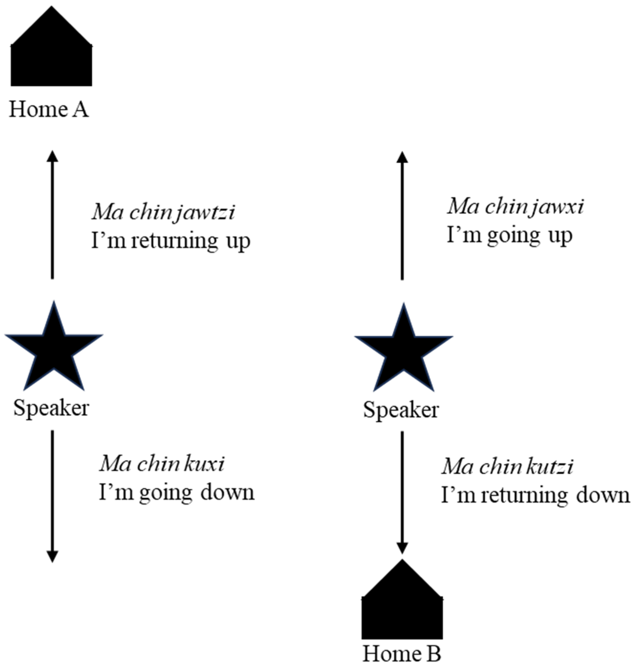 comes toward. In this instance, the mountains that serve as the implicit points of deictic reference in everyday life are named explicitly—B’ak, Xlach’e, Ma’tx, and Q’u. Related to the discussion in the previous section, while Sanjuaneros do not use the directionals