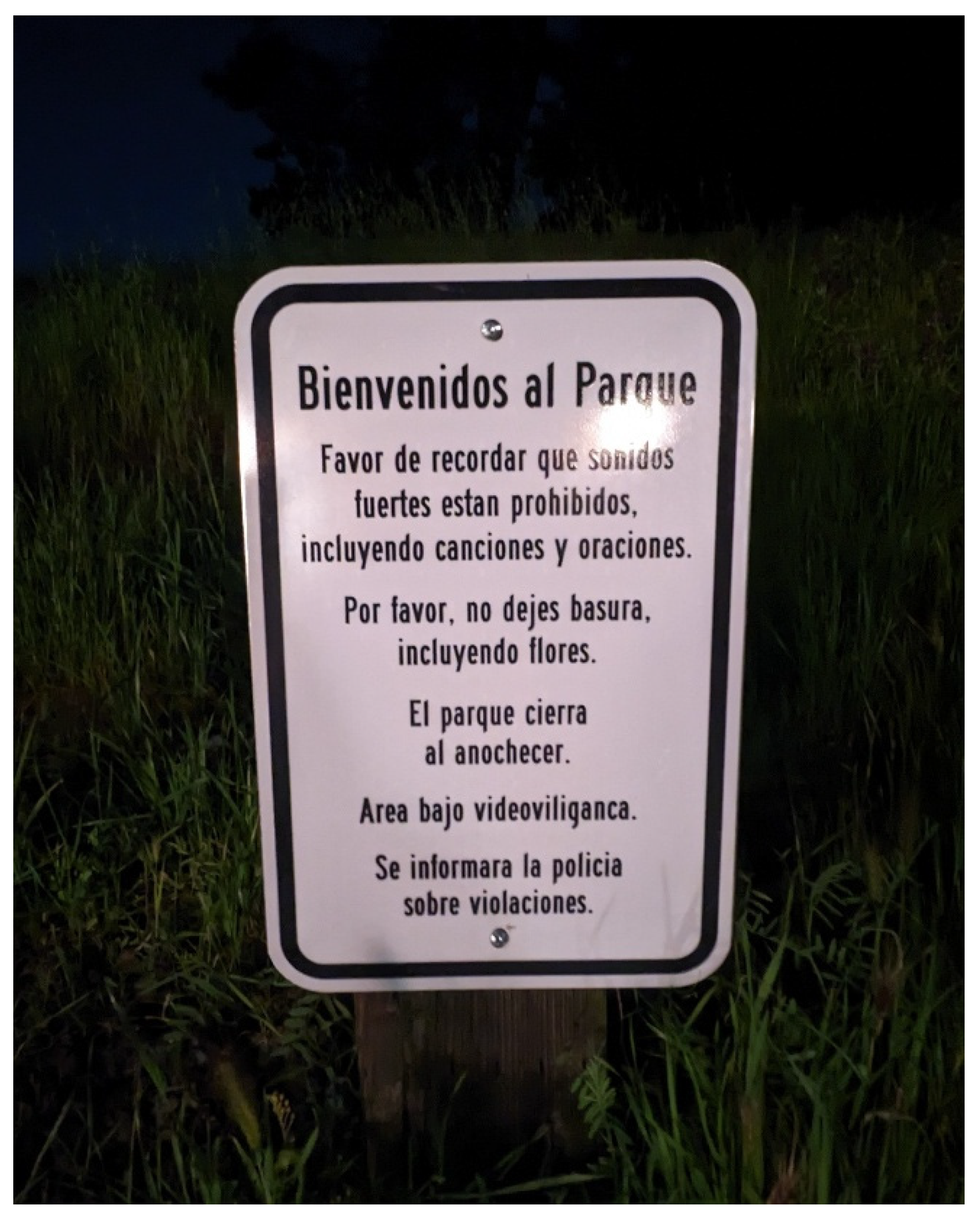 Figure 5). Just as Mam deixis is transposable to the geography of Oakland, so is the ritual of mountaintop prayer. Oakland is the primary destination for migrating Sanjuaneros, and is home to a large Mam speaking migrant population. As the immigrant community grew, Mam Christians began to seek out nearby mountain or hilltop places to pray. The parks in Oakland Hills, being the nearest and most visible place, have become a common site of Mam prayer ritual. However, the conception of a park as a site of recreation, as is common in the U.S., clashes with the conception of the park as a sacred prayer site. The sign says, in Spanish: “Welcome to the park. Please remember that loud sounds are prohibited, including songs and prayers. Please, do not leave trash, including flowers. The park closes at sunset. Area under video surveillance. Police are informed of violations.” I saw this sign when I had come to the park with a Mam family to violate every specific rule written there—to enter at night, to pray loudly, and to leave flowers.