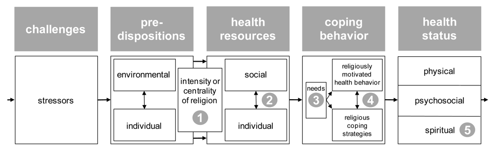 In consideration of the multitude of findings already supporting a positive correlation between general religiosity and mental health (e.g., [38]), the intensity or centrality of religiosity [39,40] is prominently integrated into our model. Intensity/centrality of religiosity can be perceived as both a personality trait and a resource for coping. Consequently, our model introduces intensity/centrality as an overlapping construct in between predispositions and health resources. It should be noted that intensity/centrality of religiosity encompasses several distinct expressions of religious life, in particular an intellectual dimension, ideology, public and private practice, and religious experience [39,41,42]. The more differentiated religious expressions a person has developed the stronger his or her general religiosity is.