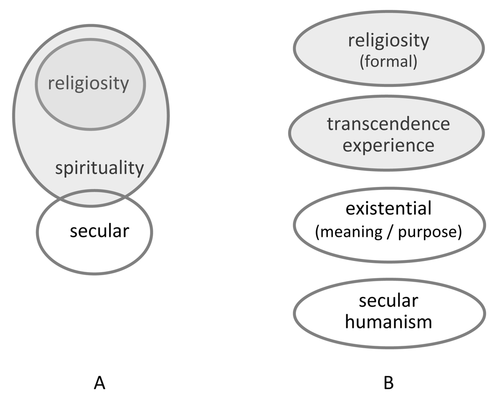 Koenig [62] raised concerns about measuring spirituality in research. He stated that spirituality was traditionally “a subset of deeply religious people”, while today it is “including religion but expanding beyond it”. In fact, spirituality is often understood today as a broader and also changing concept which may overlap with secular concepts (cf. Figure 1A) such as humanism, existentialism, and probably also with specific esoteric views. Particularly in Western societies we have to acknowledge people who regard themselves as “spiritual, but not religious”. Several of them follow more individual and pluralistic approaches. Some might be offended by institutional religiosity and thus are not belonging to a particular traditional religious system.