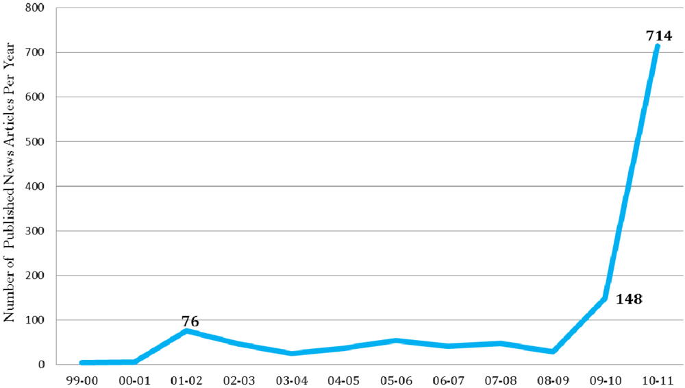 While the first spike occurs following 9/11 (total of 76 articles), coverage of American Muslims and their association to extremism leveled off in the next eight years following 9/11 to an average of 40 articles per year from 2002–2009. From April 2009–April 2010, the number of stories doubled when compared to year 2001 (from 76 to 148), and in the 12 months from April 2010 to April 2011 there were 714 news stories associating Muslim Americans with either terrorism or extremism. This recent spike parallels the growing anti-mosque movement starting with the Park51 controversy, as well as the Peter King “radical” Islam hearings, both of which put the issue of Muslim American religiosity and integration on the national agenda. It is very important to note that this is not to say the media is causing a growth in anti-Muslim attitudes through its reporting, but rather that the media is picking up on—and now more likely to report in news stories—this anti-Muslim sentiment in America today.