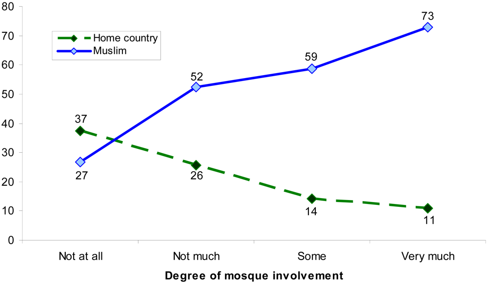 At the low end of the spectrum, out of the respondents who say they are not at all involved or rarely attend their mosque, we find 37% prefer their home country or country of ancestry identity as their primary identity and 27% prefer Muslim (see Figure 2). Home or country of ancestry identity signifies individuals who chose Saudi, Pakistani, Egyptian, Palestinian, Iraqi, Iranian, etc. as their primary means of identity. 11 As mosque involvement increases, we find fewer respondents identify primarily with their home country, and increasing percentages choosing to identify simply as Muslim. Thus, in a way, participation, attendance, and involvement in the mosque may create a new identity for American Muslims in which they identify with a religious-ethnic group, “Muslim” as opposed to national origin country groups. Throughout history, scholars of assimilation and acculturation have noted that shedding a primary identity of the home country was important to integration in America. While national origin identity may remain, we find that American mosques are certainly not encouraging or growing foreign identities, but rather, they are promoting the acceptance of an inclusive and common identity of being Muslim. One possible reason may be the diversity of the mosque in America. In most cities across the United States, only a handful of mosques exist, and most are composed of an incredibly diverse population of American Muslims, with foreign-born, U.S. born, Asian and Arab, and even Sunni and Shia faiths praying side-by-side. The result may be a stronger sense of commonality as a religious and ethnic minority group in the U.S. It is in this context within the U.S. that people now begin to identify themselves not just as Muslims, but as American Muslims. This we believe begins to lay the groundwork for an integrative role for the mosque in American civic life. While the findings do not specifically demonstrate an increase in “American” identity, the movement away from an explicit national origin identity may suggest the adoption of a common minority group label in America. However, the identity as Muslim does not preclude the identity as American, and in fact may compliment it. For example, recent research by Fraga et al. [51] on Latinos, another diverse minority group, has found that support for the pan-ethnic label Hispanic or Latino actually compliments identity as American in the 2006 Latino National Survey. We think a similar process is at work among Muslims, whereby those more involved in the American mosque begin to think more as a common group in America, and the first step is by embracing a common identity as Muslim, as opposed to a national origin identity such as Iraqi or Jordanian.