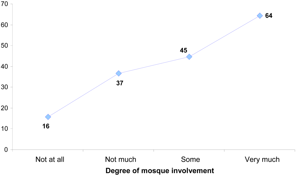 Beyond identity, we noted that mosque involvement should also be related to a strong sense of shared group commonality. We asked respondents if they felt Muslims living in the United States have much in common with each other, and on this point, mosque involvement shows a steady increase in perceptions of group commonality. Among people not at all involved with their mosque, just 16% think they have “a great deal” in common with other American Muslims, however this rate grows to 64% among those who are quite involved with their mosque – a very strong association (see Figure 3). Concepts such as group commonality and linked fate have been shown to be important predictors of political involvement among African Americans and Latinos, and we would expect also the same among Muslim Americans [52,53]. If the mosque is contributing to a stronger sense of group commonality and shared identity, it is also contributing to a group-based resource that encourages civic and political participation.